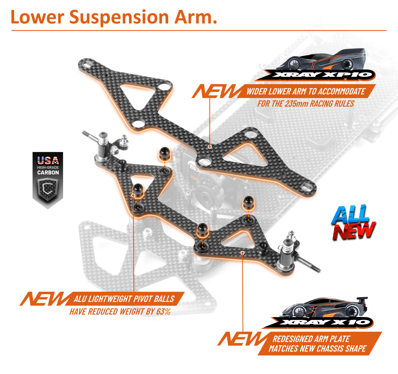 The carbon fiber front lower suspension arm plate is designed to match the chassis width and features optimized geometry. XP10 features a wider lower arm to accommodate for the 235mm racing rules.