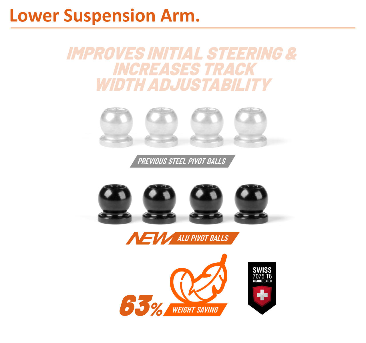 - Aluminum lower arm pivot balls included in the kit for weight savings