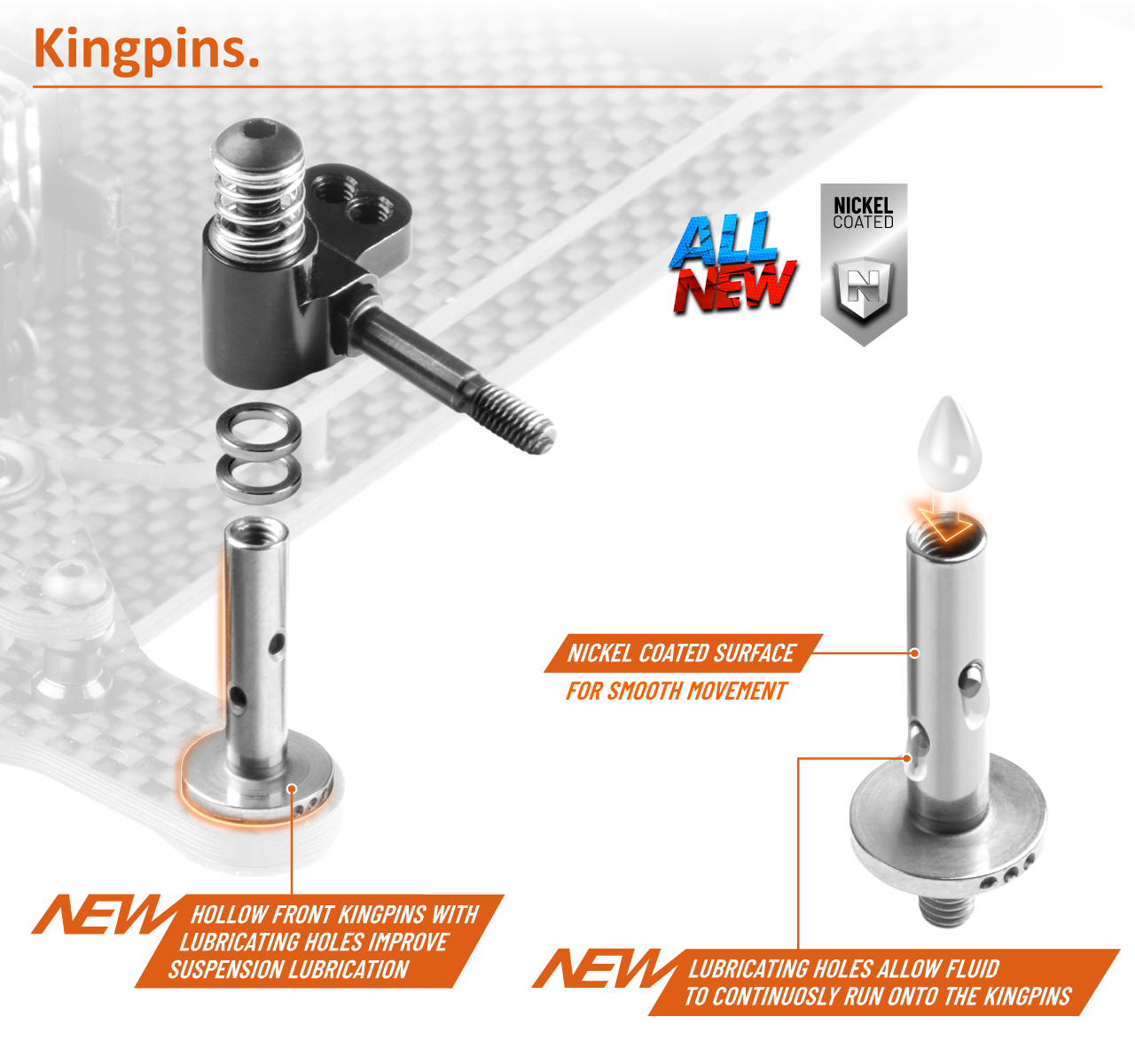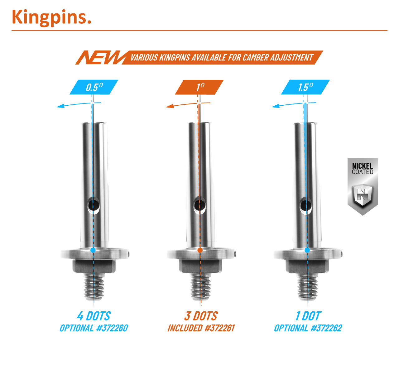 All-new super-smooth, hardened steel 4mm kingpins provide the foundation for the Tweak Free Front Suspension. The kingpins have a new, stronger design with a machined 1.5° camber angle machined into the kingpin for precise suspension geometry. Optional 1.0° and 2.0° camber king-pins are available to adjust the camber in fixed steps.