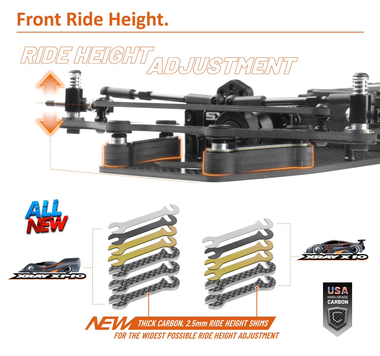 - Thick carbon fiber shims included for the widest possible range of front ride height settings
