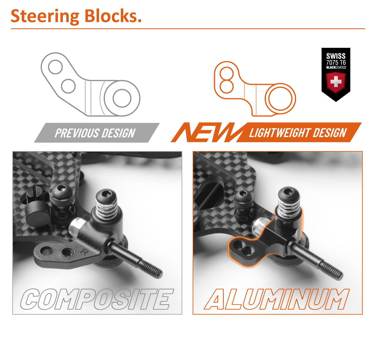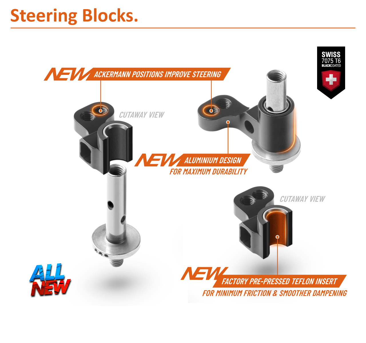 The steering blocks are machined from lightweight Swiss 7075 T6 aluminum material.