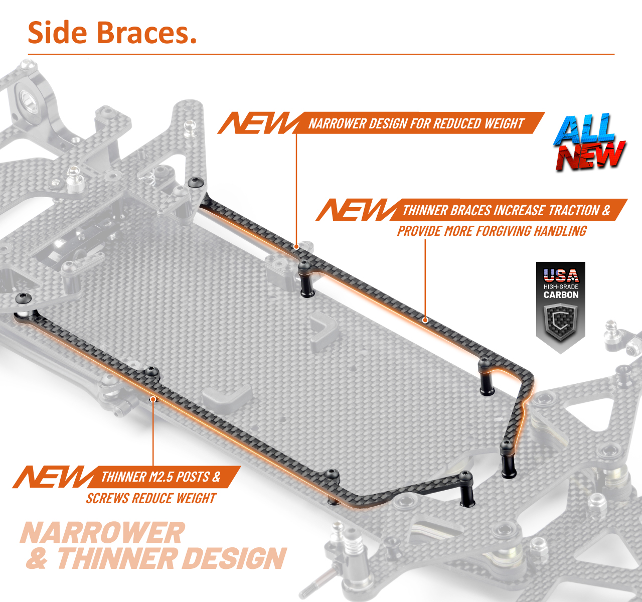The 2.0mm side braces follow the chassis profile for optimal chassis stiffness. The narrow width design saves weight and leaves plenty of space for electronics. Braces use M2.5 posts and screws for additional weight savings and removes weight from outer perimeter locations for improved rotation.
