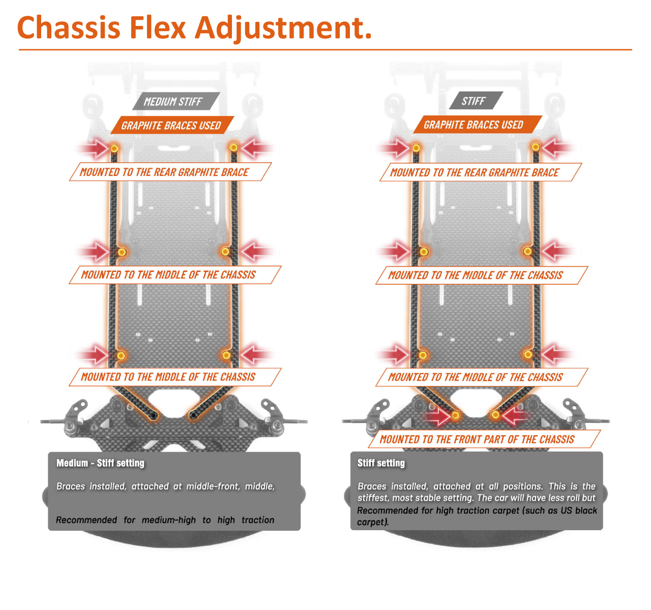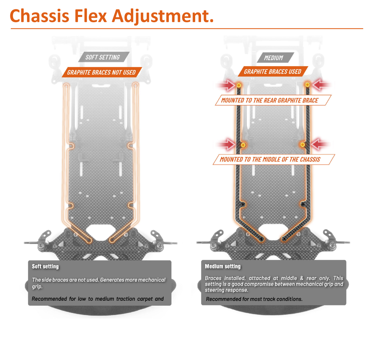 Graphite side braces are mounted to the rear brace, and to the chassis via aluminum posts, and offer four flex setting alternatives to adjust the chassis characteristics for different track conditions.