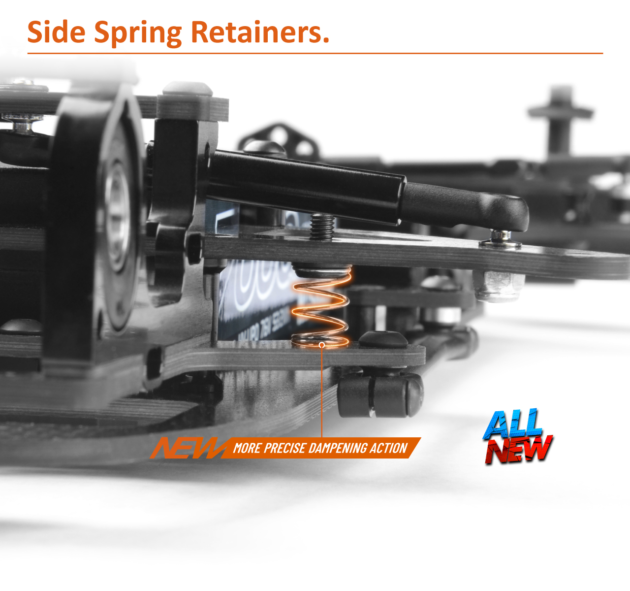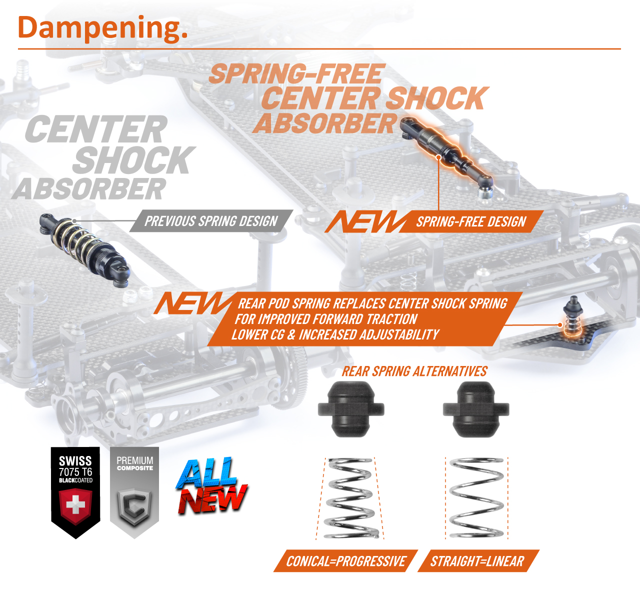 All-new rear POD spring replaces the center shock spring, improving forward traction while offering increased adjustability and lower CG. A versatile soft rear spring is included in the kit.