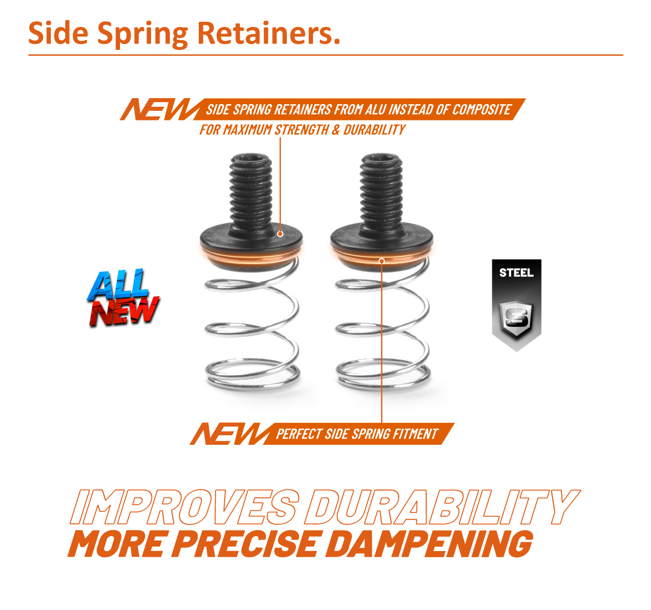 The side spring retainers, made from a steel material, feature a precise and consistent side dampening action.