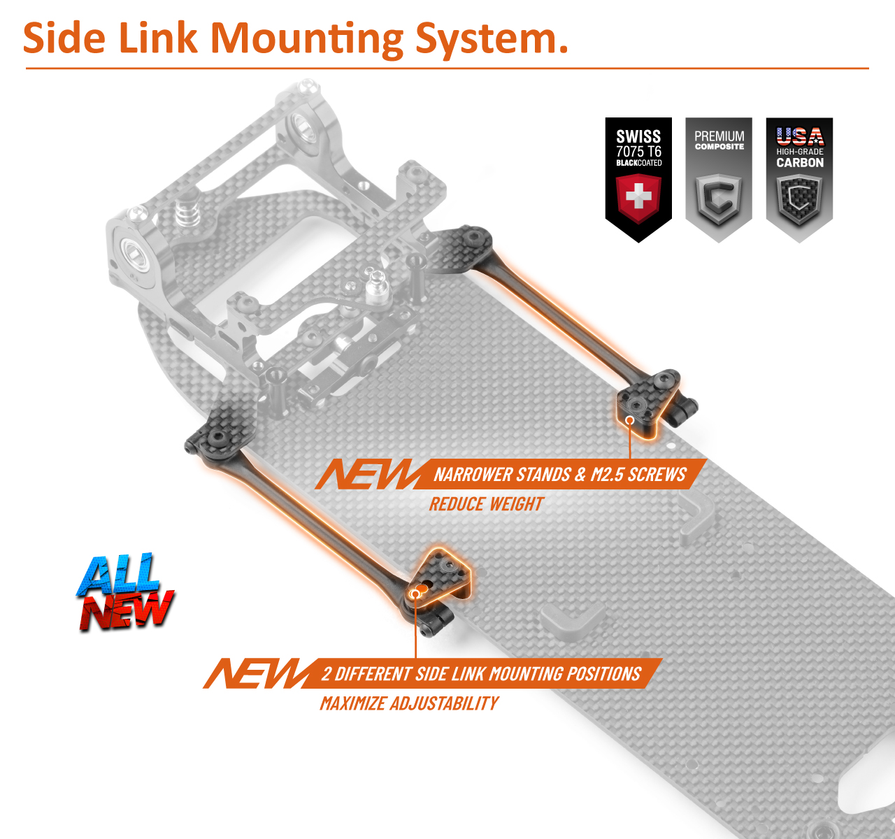 - 2-pin carbon fiber side link plates integrate with aluminum holders for reliable alignment and offer 2 side link front pivot mounting positions for maximum adjustability