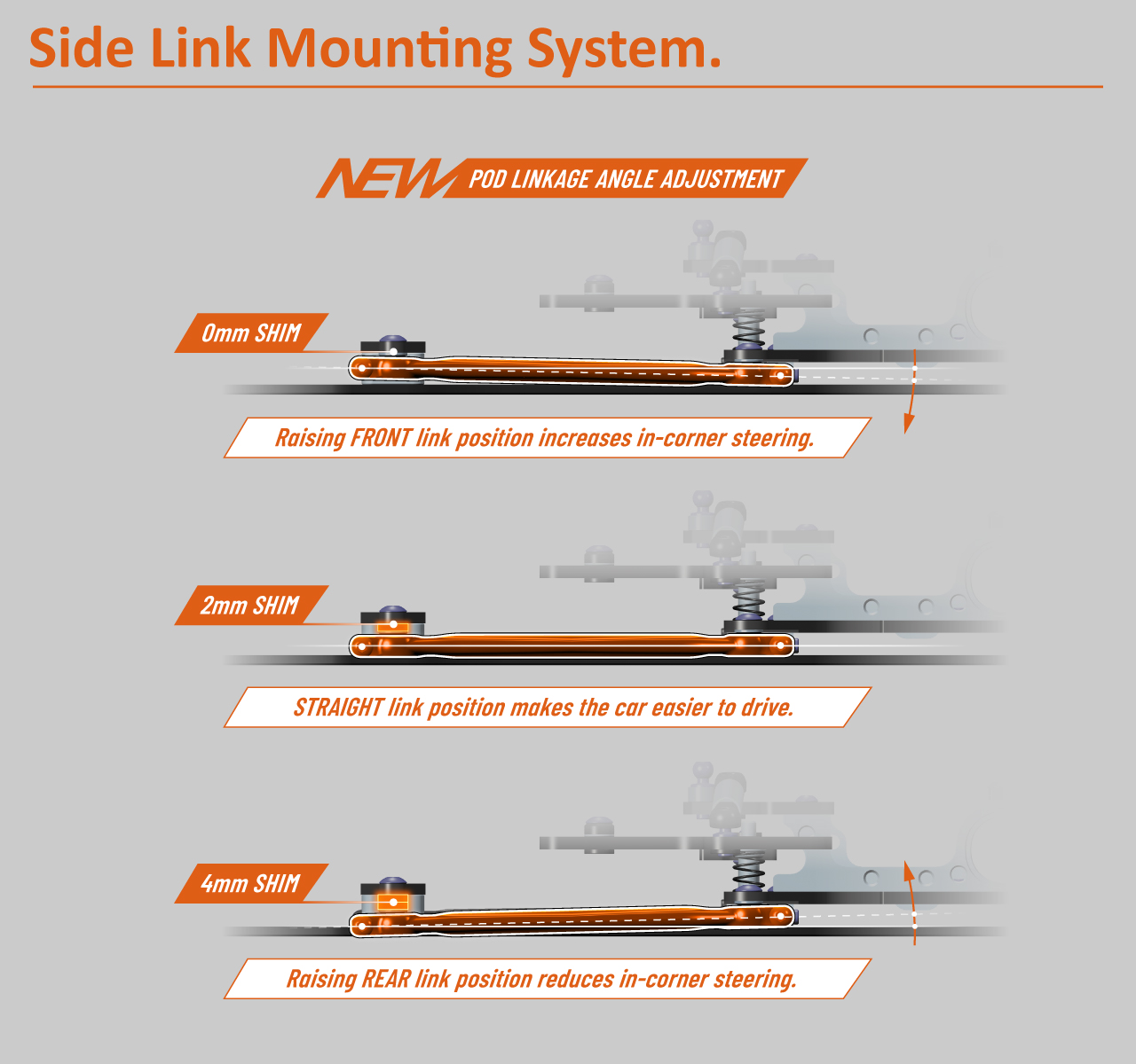 - Aluminum side link holders with 2-pin design for more rigidity and maximum tweak resistance