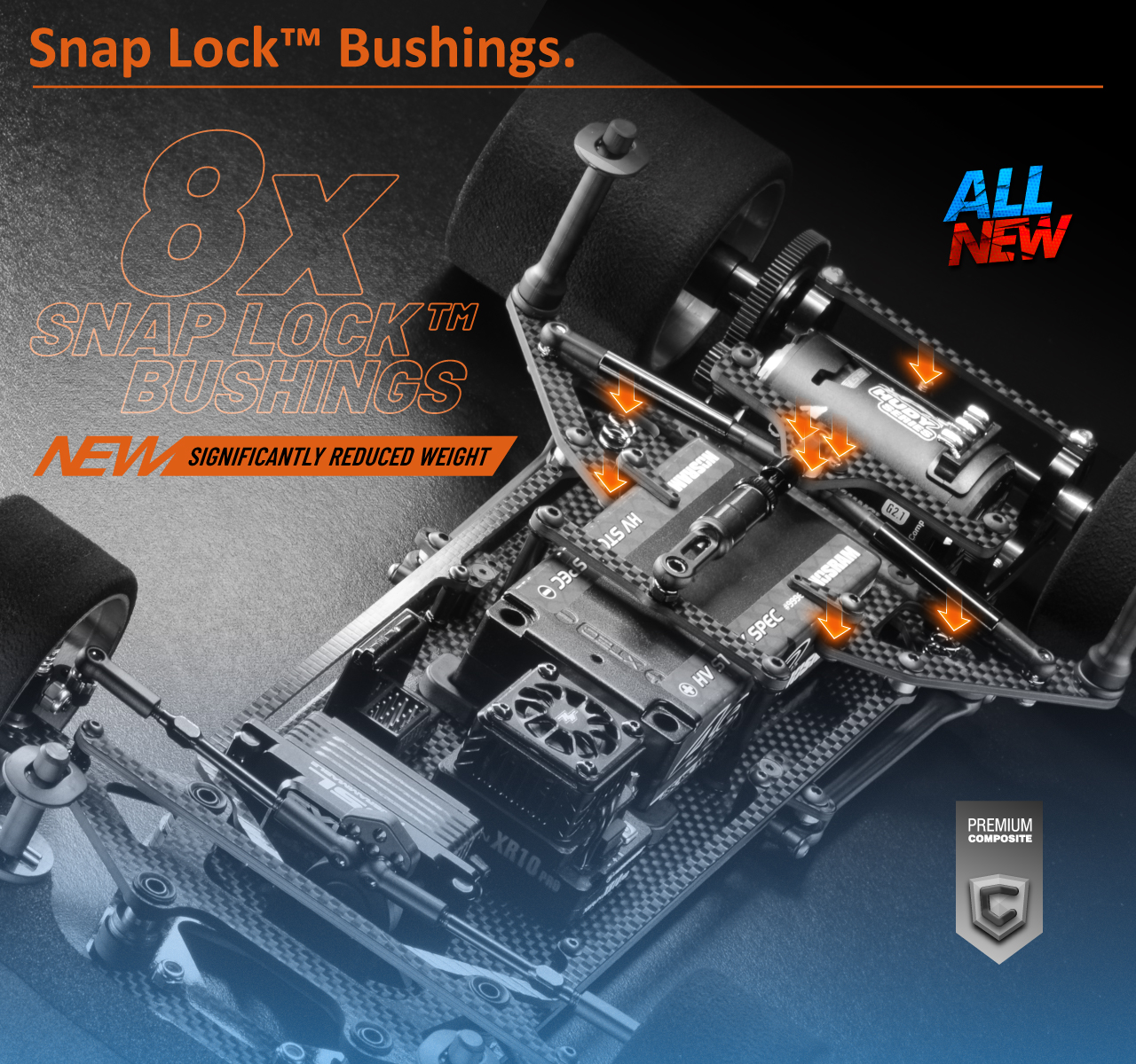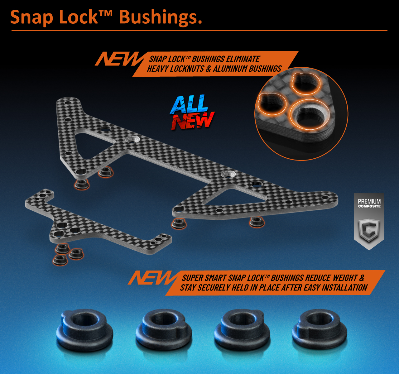 All-new super smart XRAY Snap Lock Bushings replace locknuts and aluminum bushings. The 8 super small bushings reduce weight and stay securely held in place after installation for easy chassis assembly and maintenance.