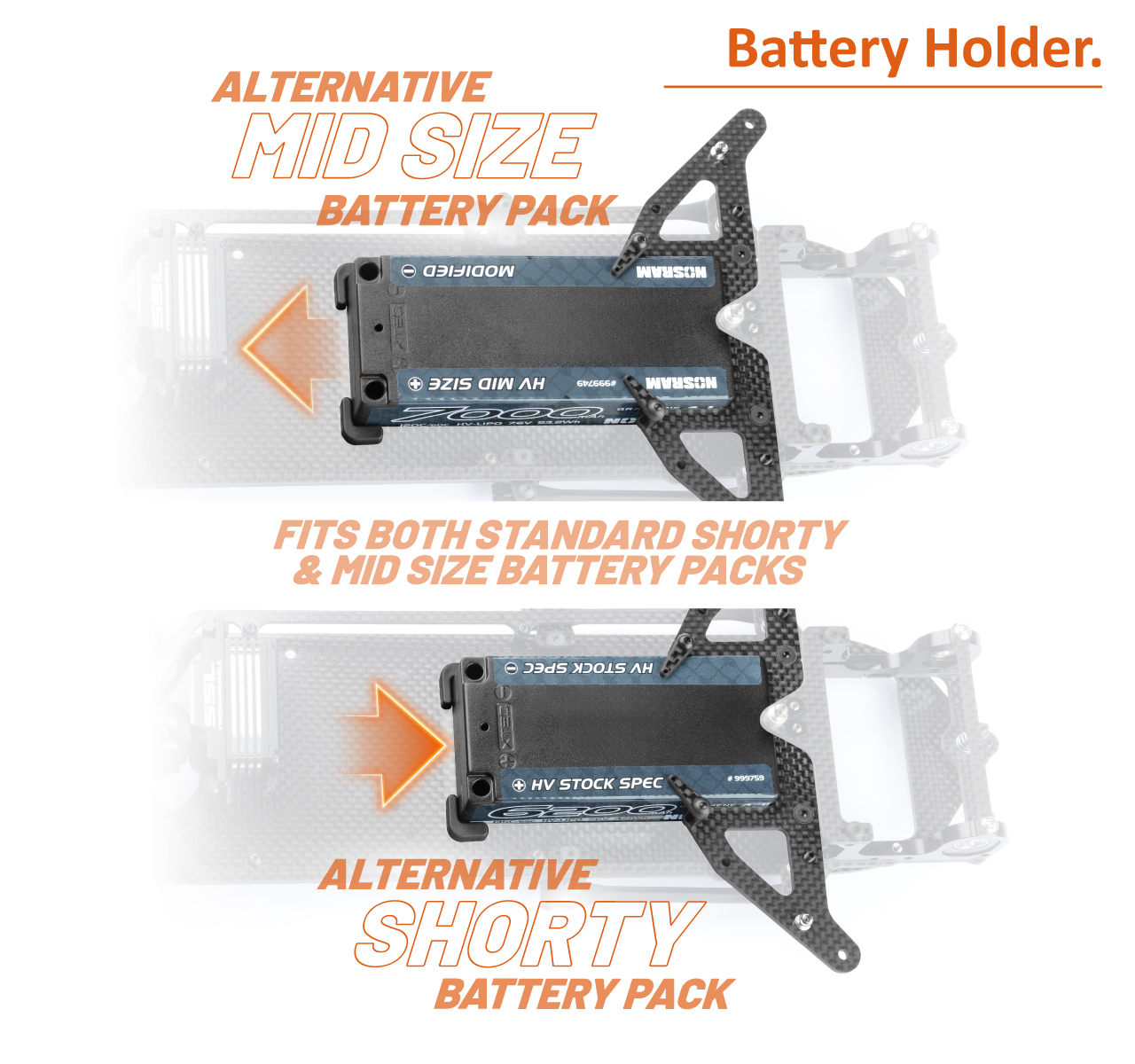 - Battery backstop & chassis holes to accommodate for both standard shorty and mid size battery packs