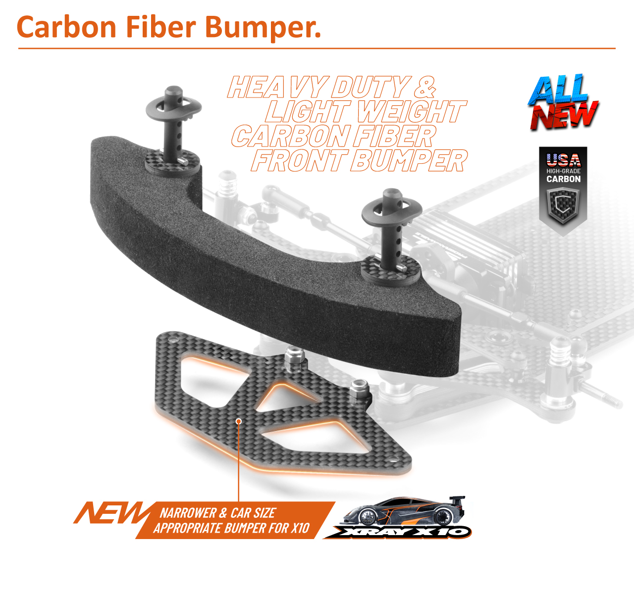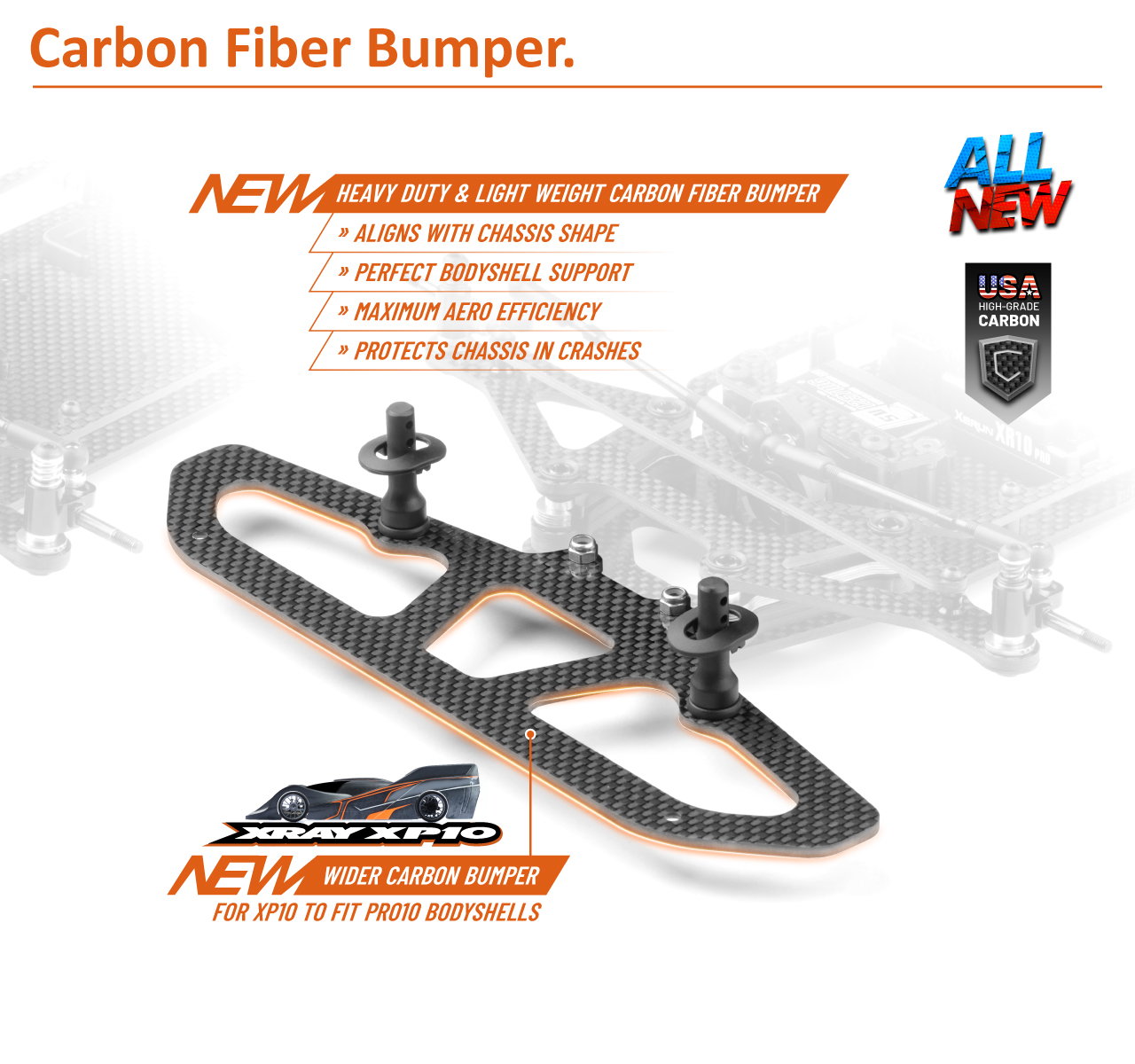 Wide, aligns with the chassis shape and fits popular bodyshell types for XP10. Smaller, carbon fiber bumper included to accommodate for the X10 car size & racing categories.