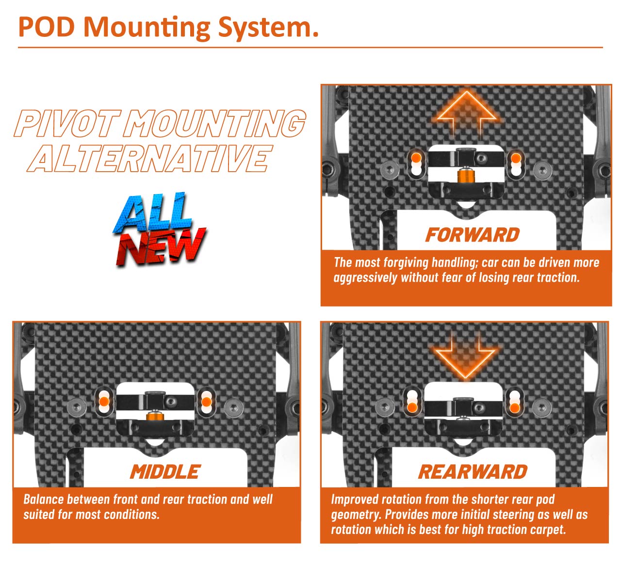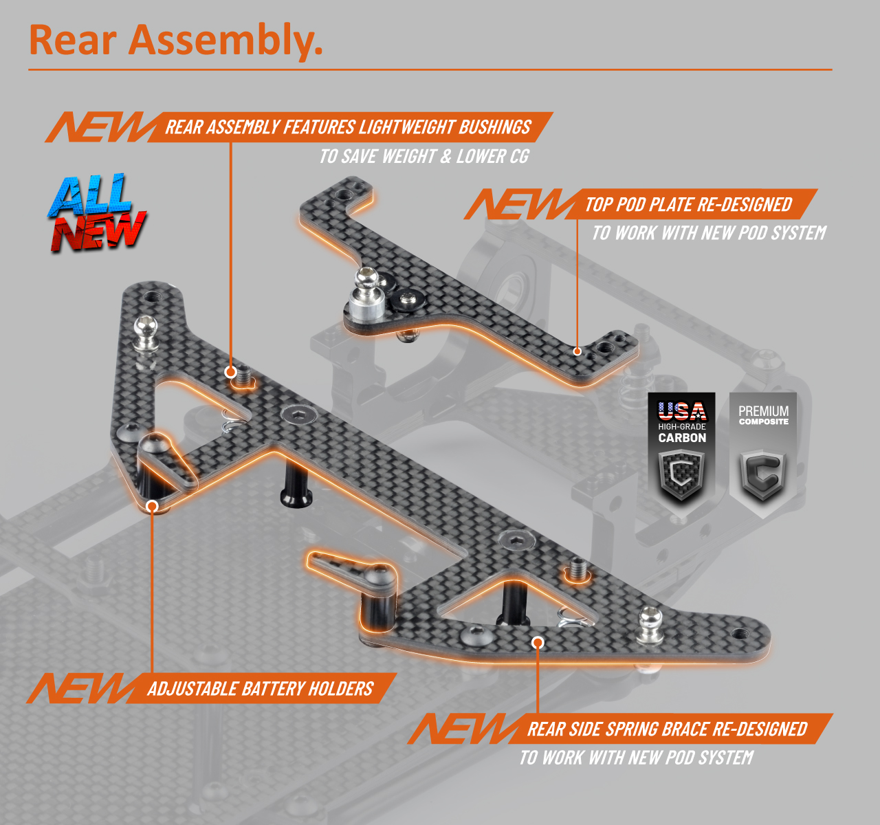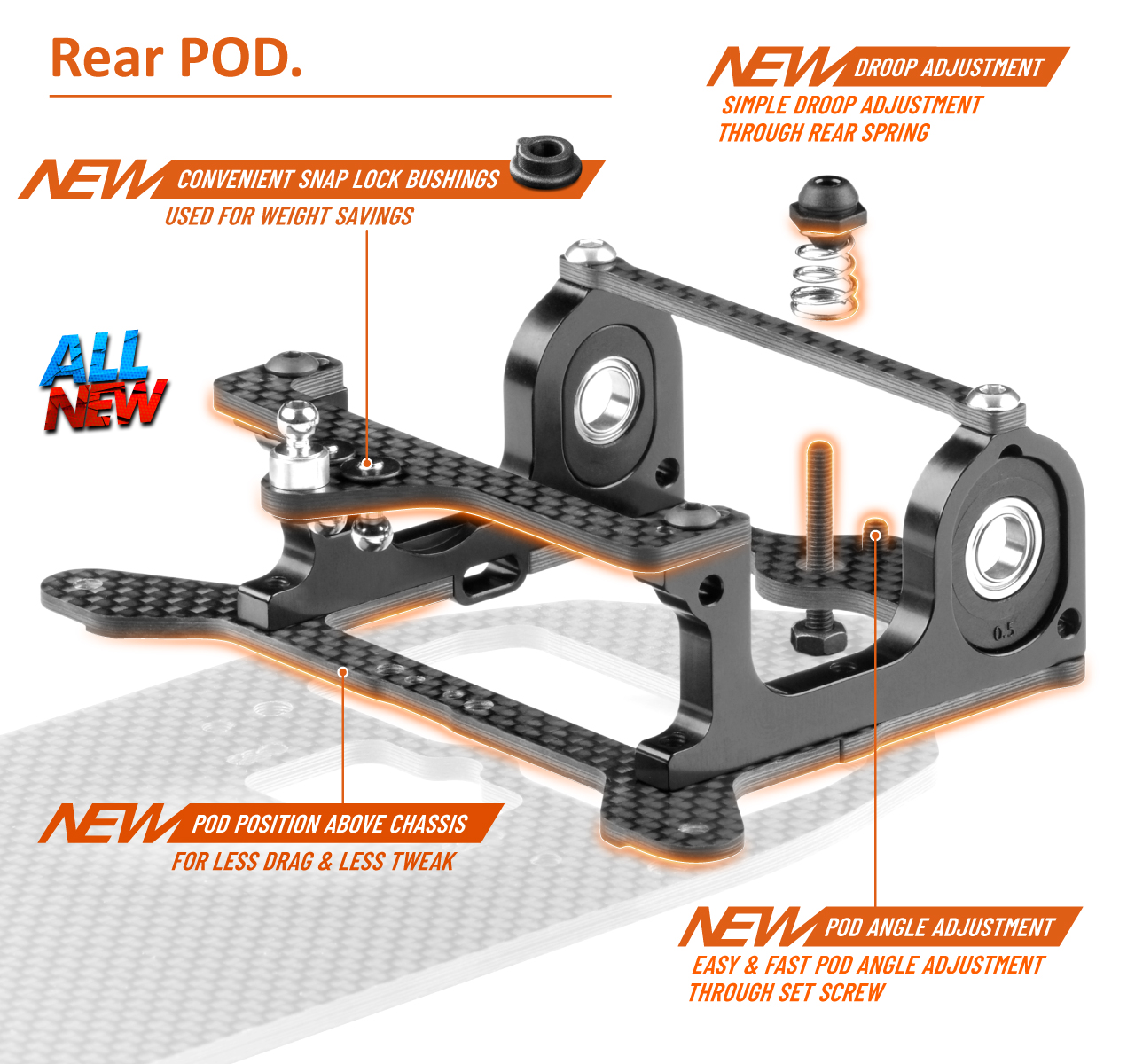 The 2-piece rear pod concept is positioned above the one-piece chassis. The configuration is highly adjustable with superior tweak resistance. The pod plate is used to set droop, pod angle adjustment and supports the side springs. The rear spring location creates exceptional forward traction and has a low CG.