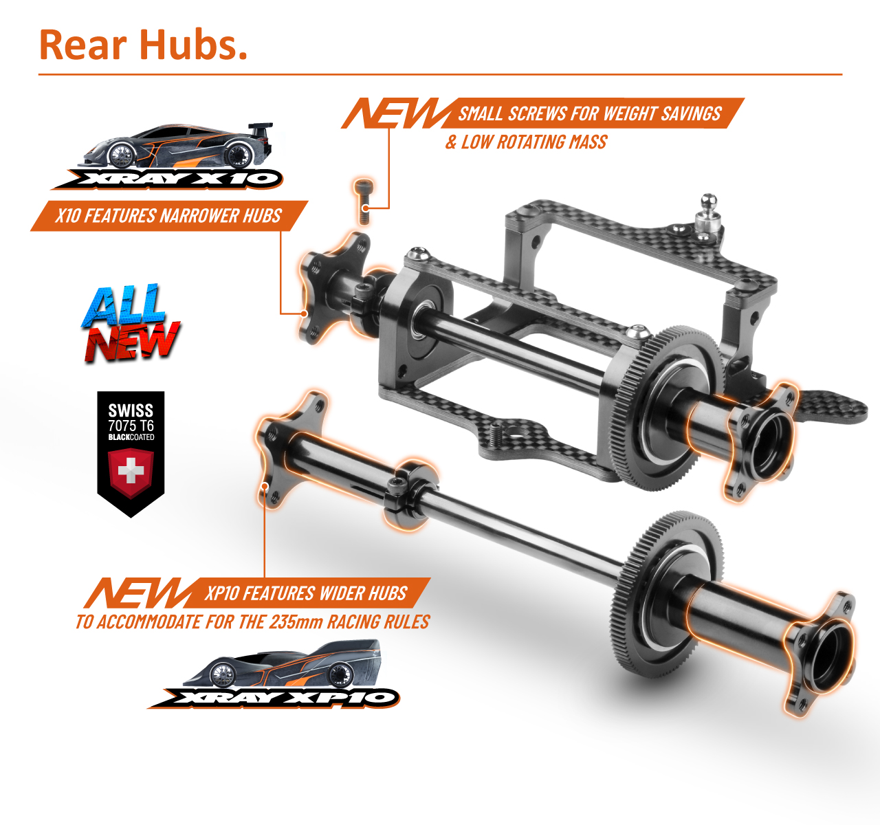 Wide rear wheel hubs provide secure installation on the rear axle and provides a wide range of track width adjustability. XP10 features wider hubs, X10 features narrower hubs.