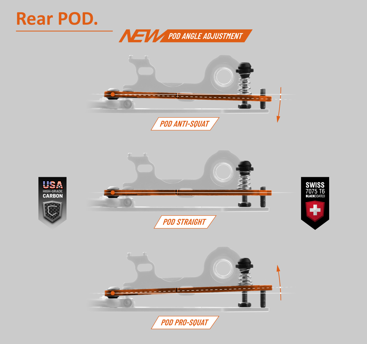 - 2-piece lower pod plate mounts to the bulkheads, offering droop and pod angle adjustments with support for the side springs