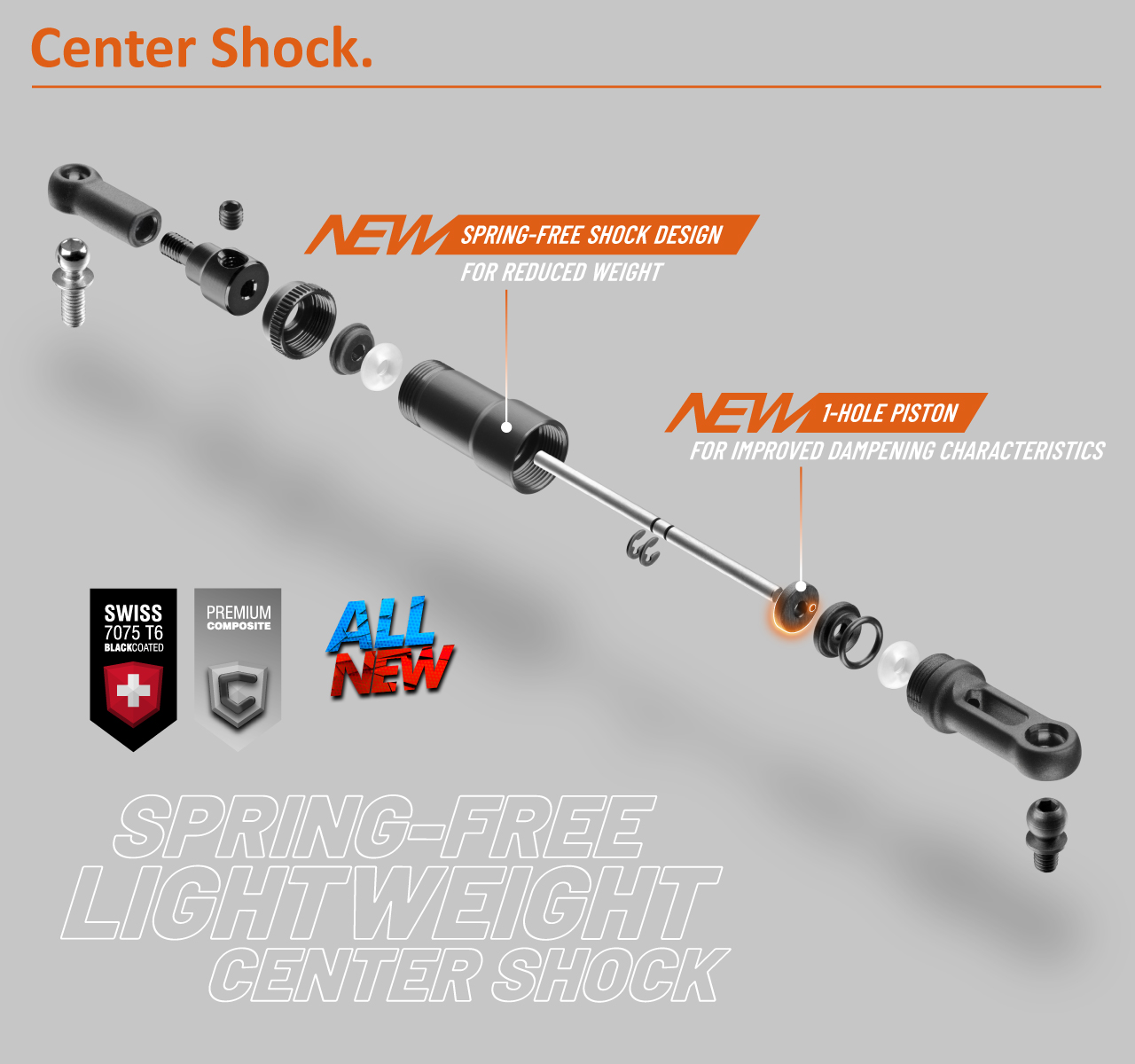 All-new center shock provides exceptional bump handling, low maintenance, and helps lower CG. The spring-free design significantly reduces weights and the 1-hole piston configuration ensures consistent handling over bumps.