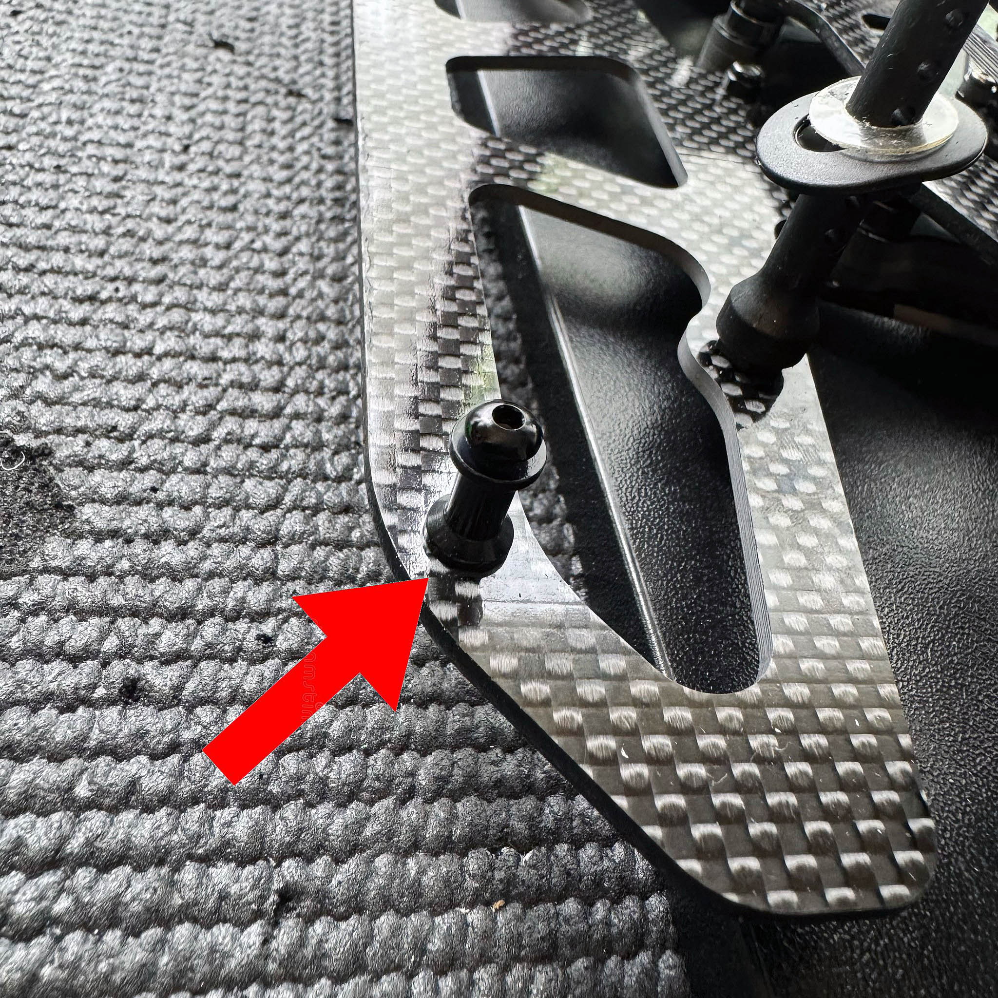 1. The holes in the front of the carbon bumper can be used for adding small posts to support the front lip of the bodyshell. You can use any of the stand-offs from the X12, X10 or X1 platforms depending on the height desired. Add a screw (with thread lock) for fine tuning. I set the height so that they're close to touching the bodyshell.