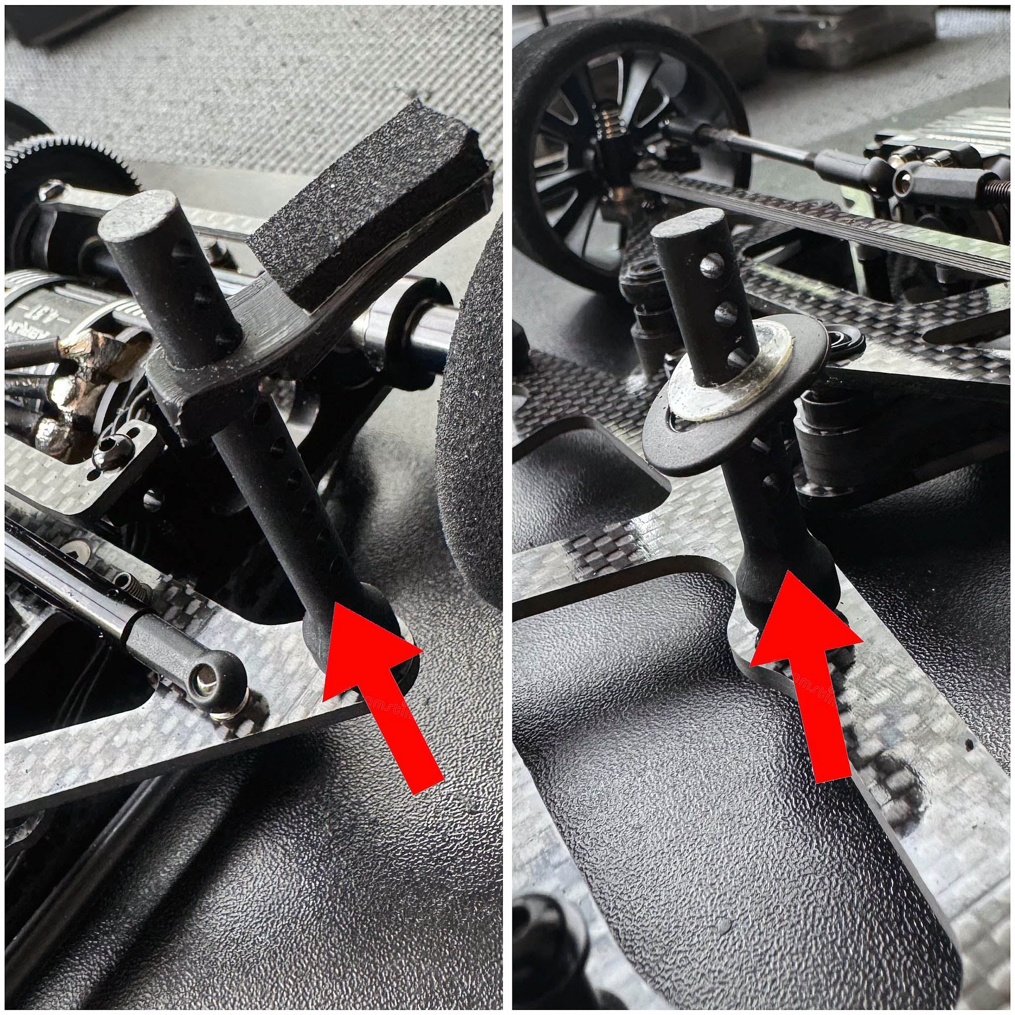 2. I recommend optional hard body posts (#301322-H), especially for the modified class. This gives better support for the body in high speed sections. Keep in mind that a Pro10 bodyshell is heavier than a 1/12 bodyshell, for example, and thus, needs more support/rigidity.
