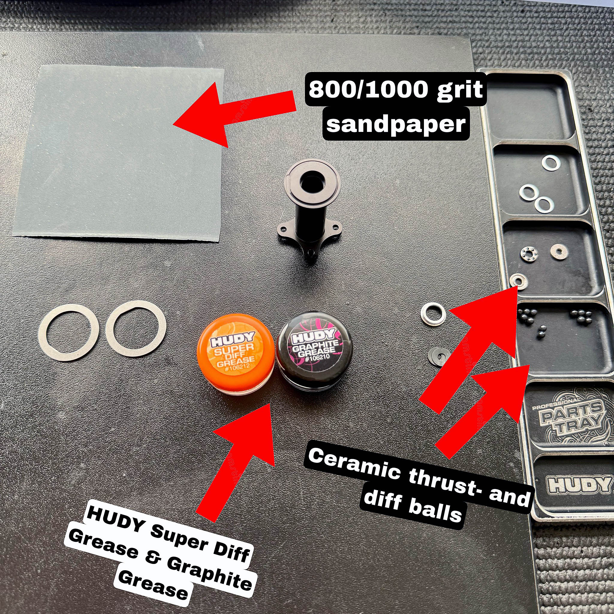 3. Ball differential build. Absolutely crucial for a good car performance. I recommend using optional ceramic diff balls and thrust bearing (#930320 & 930328). The ceramic parts allows for a freer- and longer lasting diff. I recommend the HUDY Super Diff Grease (#106212) for the diff balls, and Graphite Grease (#106210) for the thrust bearing. I sand the diff rings on a 800 or 1000 grit sandpaper (wet) to create a rougher surface for the diff balls to grab onto. Remember to break-in the diff for 20-30s on low RPM. Check out these videos for more details: