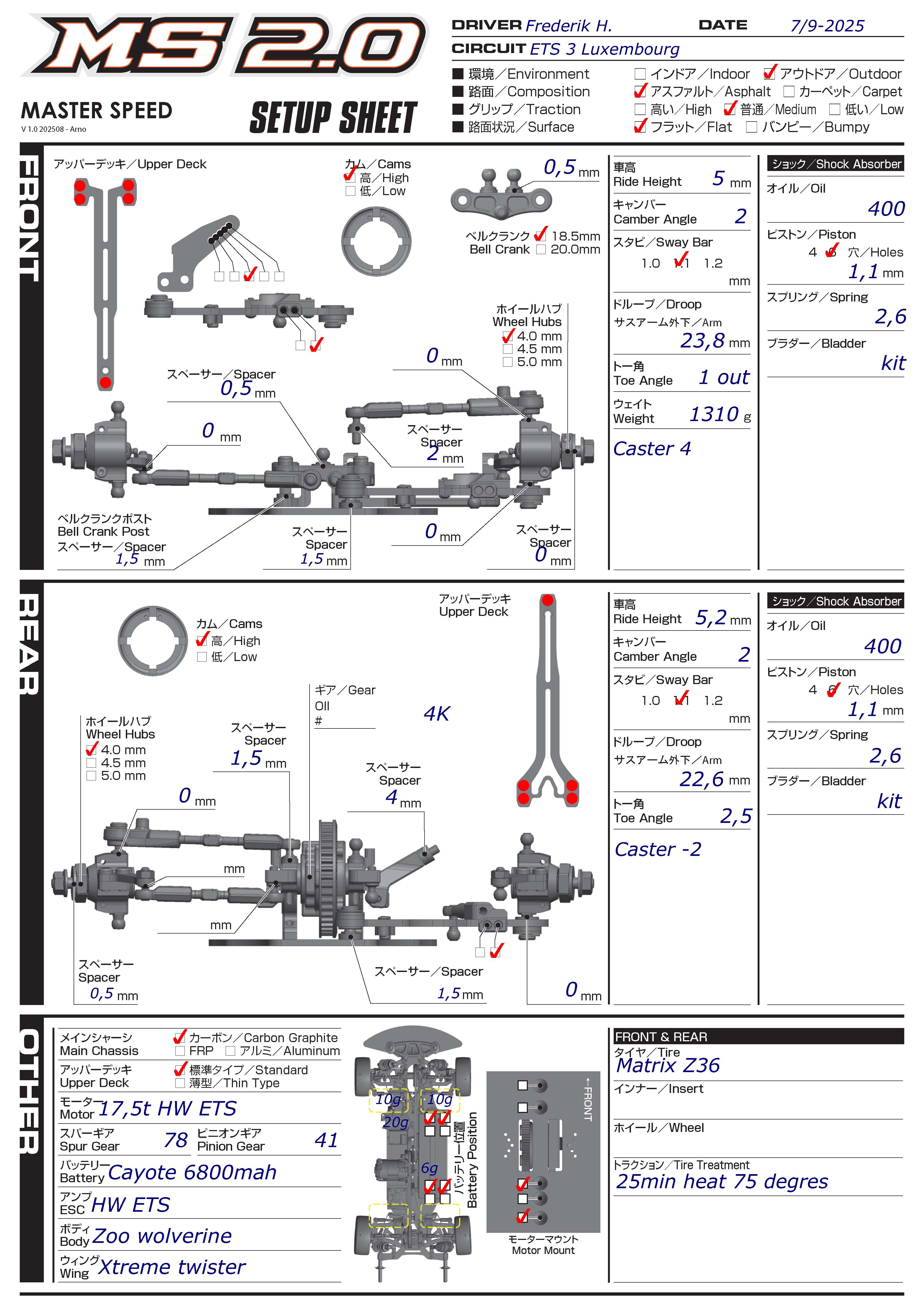 Yokomo factory driver Frederik Hovgaard is running the new Master Speed MS2.0 touring car here at ETS RD3 in Luxembourg. Frederik had great success with the prototype version of the car at the EFRA Euros in Utrecht, and is running a full production car for the first time this weekend. The car is equipped with some T-Work`s goodies like titanium screws, balance weights, and titanium roll-bar adjusters. The rest of the car is “bone stock” as it comes out of the box. Frederik`s car is powered by a Team Cayote 6800mah battery in combination with the Hobbywing ETS Pro Stock combo, and steered by his good old Sanwa M12 with a SRT BH815S servo. Finally, his car is topped off by a 0,4mm ZooRacing Wolverine body shell! Chassis: Yokomo Master Speed MS2.0 Body Shell: ZooRacing Wolvering 0,4mm Speedo: Hobbywing Xerun XR10 Stock Spec ETS Motor: Hobbywing Xerun V10 G4R 17.5T ETS Battery: Team Cayote 6800mah Radio: Sanwa M12 Servo: SRT BH815S Tires: Matrix Z36 ETS Handout Sponsors and support: Yokomo, HS-Racing, Twork`s, SRT, Milansport, Willspeed, BSM-reklame