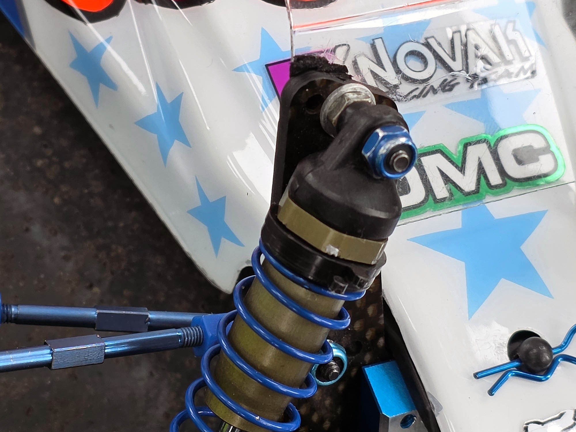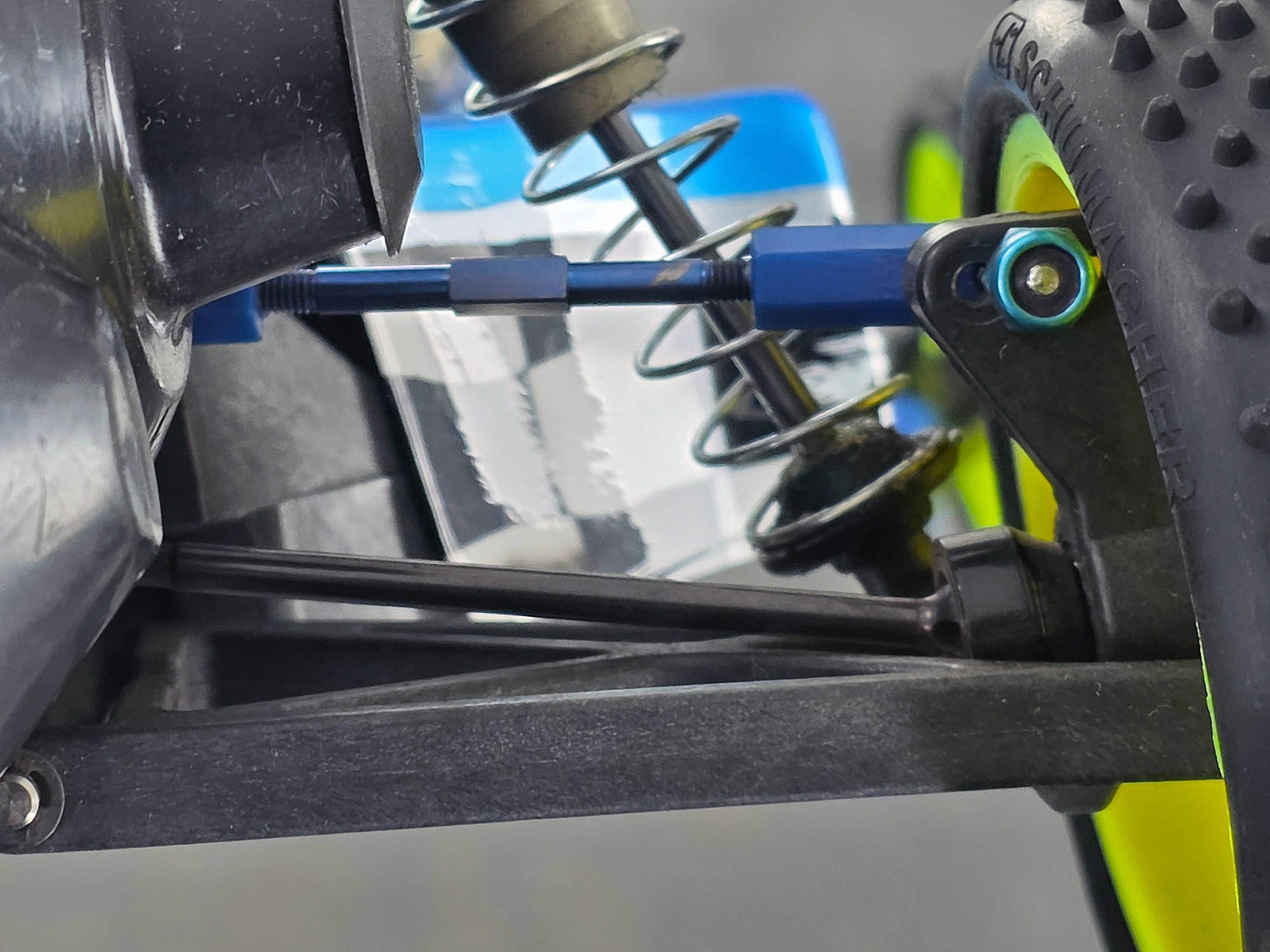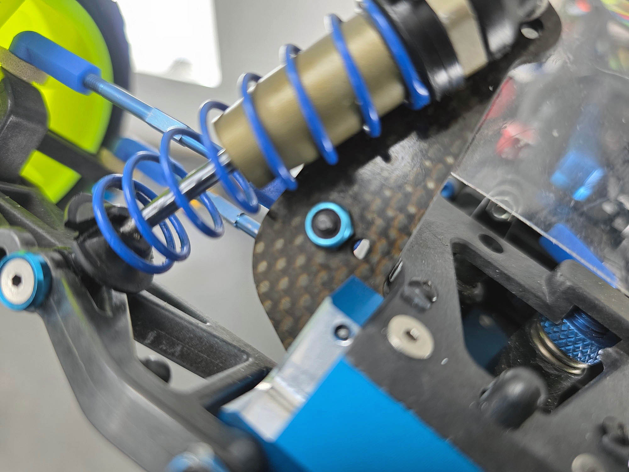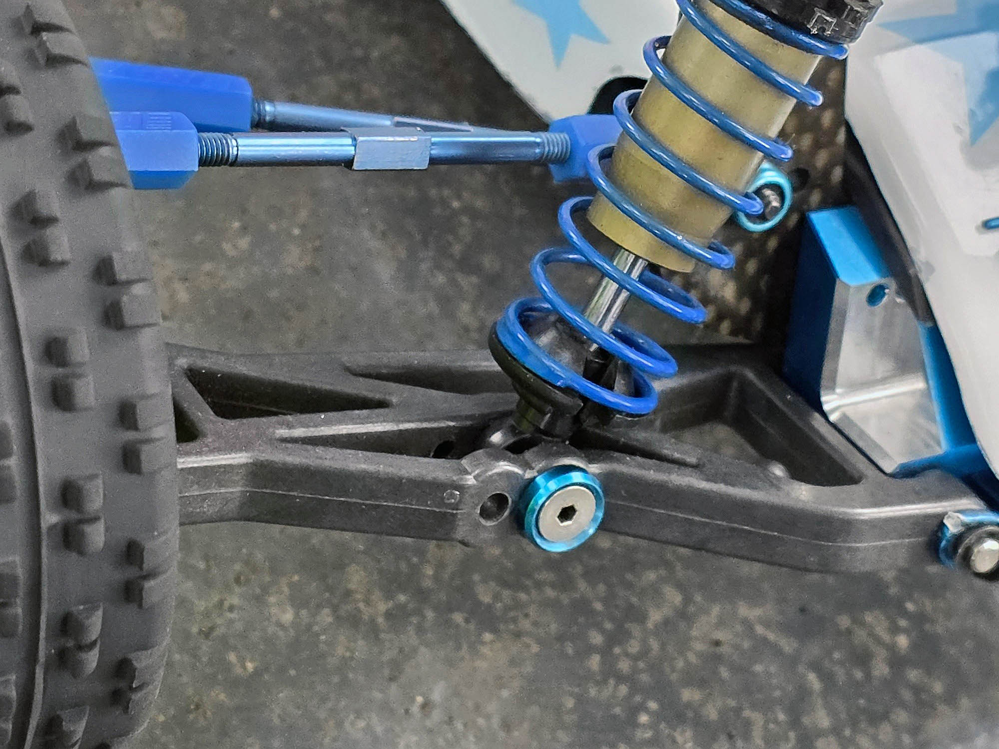 JC racing +2mm driveshafts to allow a bit more droop than the factory amount of zero. I used AE +2mm shock eyelets to get the shocks a bit longer.