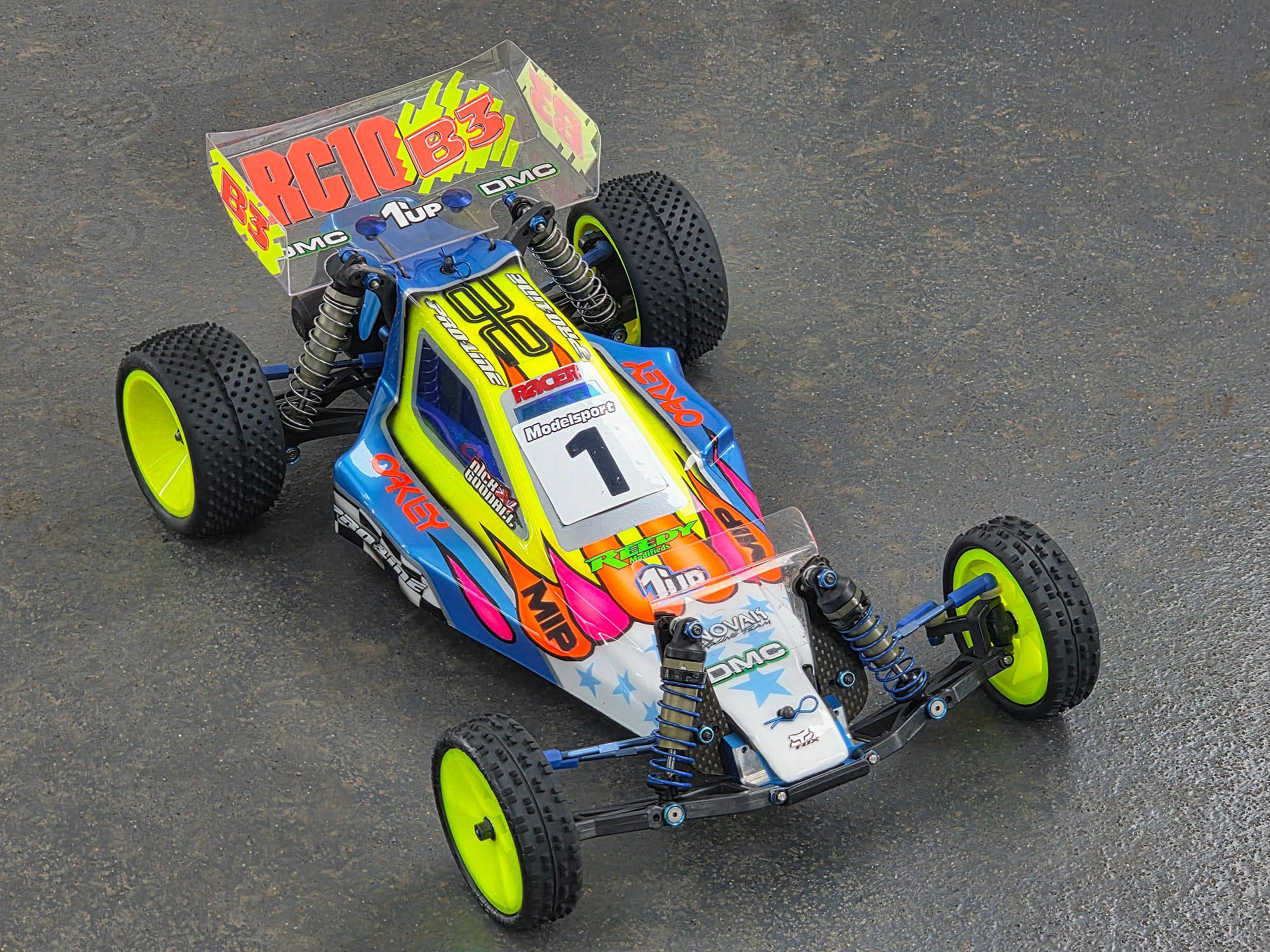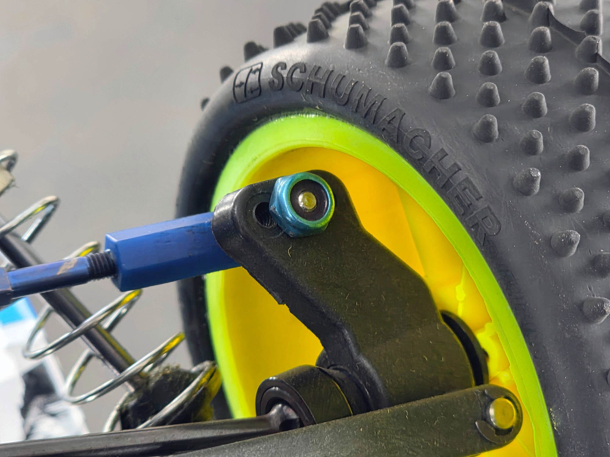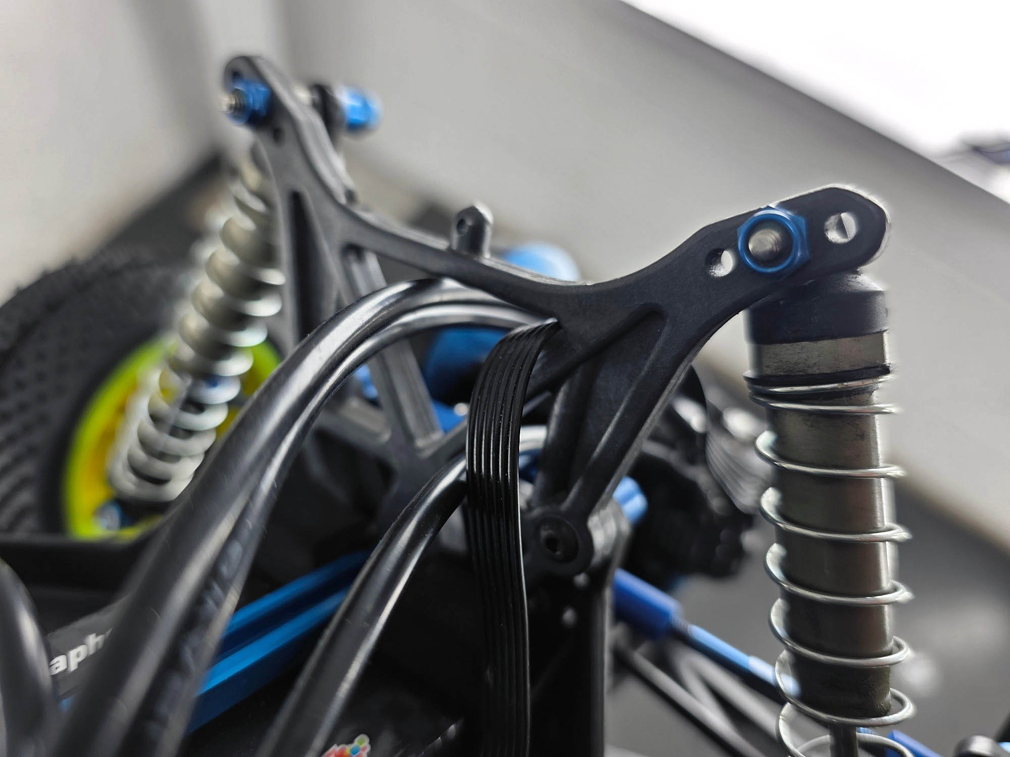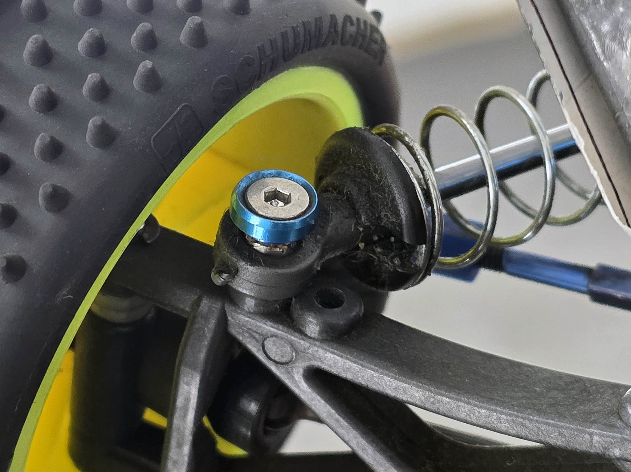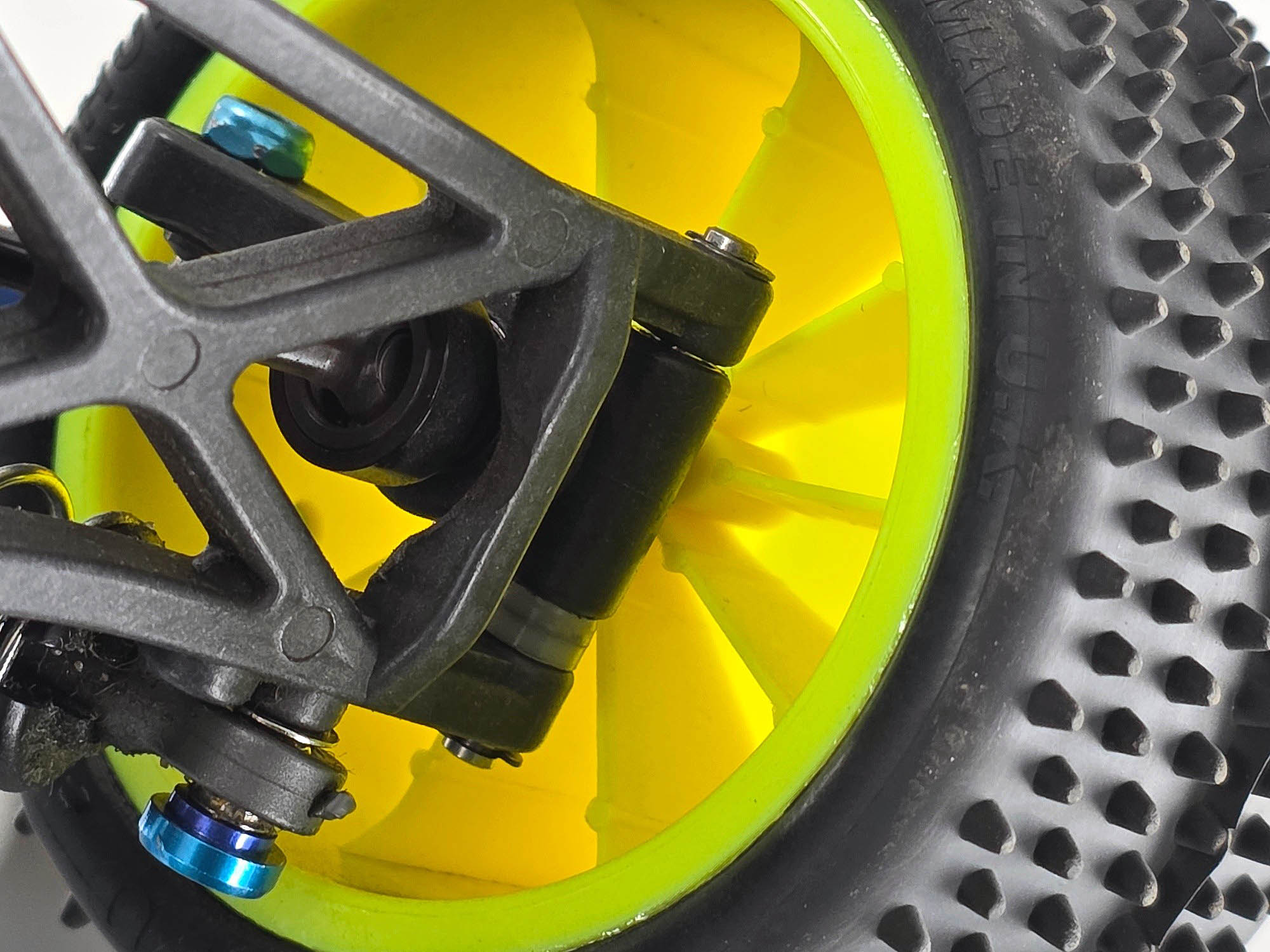 JC racing +2mm driveshafts to allow a bit more droop than the factory amount of zero. I used AE +2mm shock eyelets to get the shocks a bit longer.
