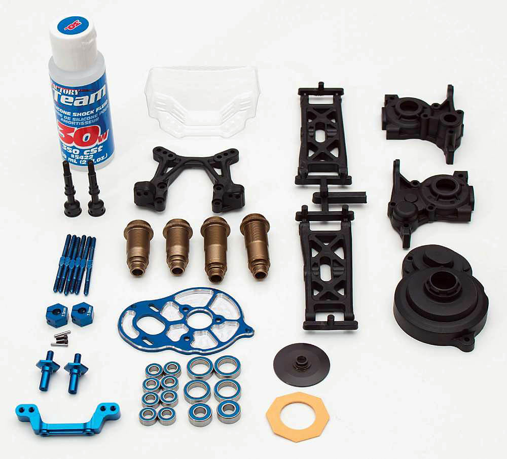 When Team Associated released the RC10B5 and B5M, the RC community was in shock that AE released two cars for specific types of tracks rather than just one buggy for all purpose use. There were mixed emotions from some who did not want to buy two kits and two sets of electronics to run the AE cars. But before long it was certain that many drivers preferred the B5M over the B5 rear motor car and the B5M has stuck around while the B5 has moved to the discontinued list. With today’s high bite prepped tracks the B5M is the right buggy for the job, but those who jumped aboard the B5M train early on may be not be using the platform to its full potential. Since the B5M’s release, AE has released the Super Lite and after its latest World Championship a CE buggy has also been released, so standard B5M owners don’t have the benefit of the latest parts on their machine. Rather than make you purchase one of the new buggies, AE gathered up the necessities for B5M owners to get up to date all in one convenient upgrade kit.