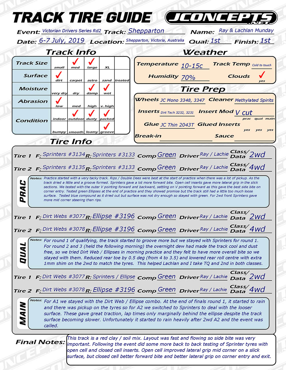 The track was hard packed but with winter weather it changed through the weekend from tacky to slick to grooved then back to slick again when it rained. Tyre choice was tricky but we found the new JConcepts Sprinters in Green (Super Soft) were really good when the track was slightly damp or dusty, and the Ellipse tyres in green were great when the track was grooved. |