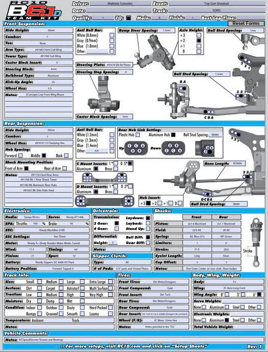 2018 Top Gun Setup, track had stupid grip, so I went to the B6 steering plates, then Austin J Pannone lowered the rear ball stud to 3mm, from 5mm to get the car a little stiffer, and raised the C mount to .5up to give the car some corner speed! But other then that pretty much the normal setup! |