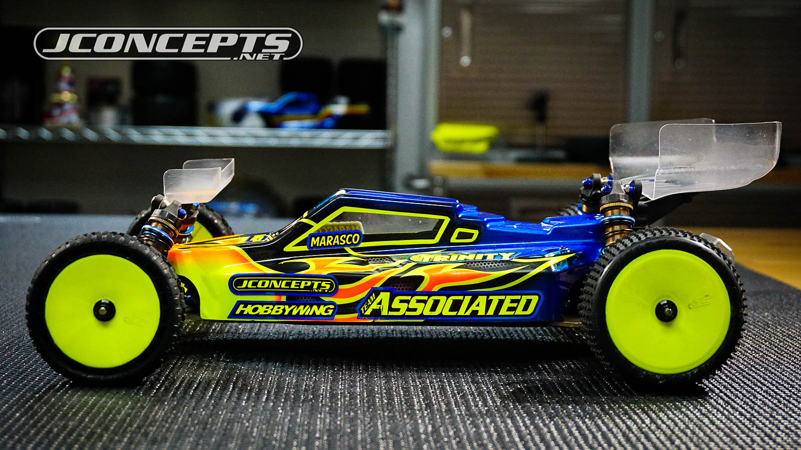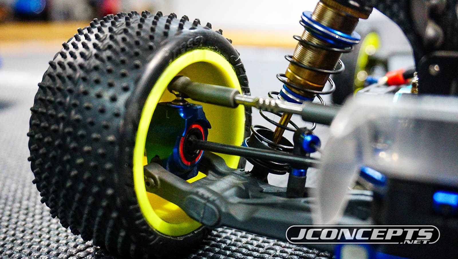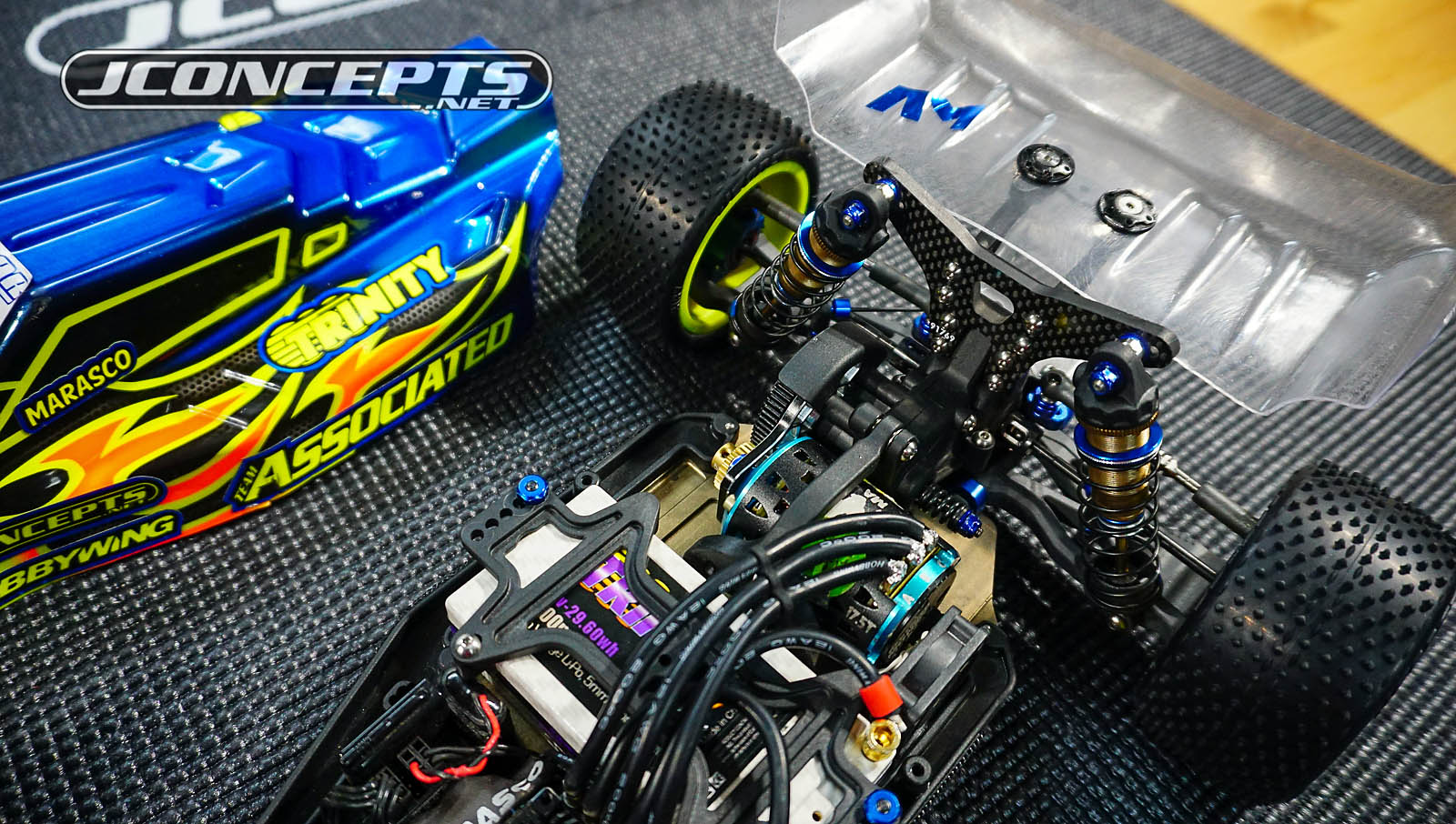 In option colors of yellow or white, the JConcepts Mono Rear Wheels have been praised by the team and preferred by most of our team drivers including World Champions such as Ryan Maifield, Ryan Cavalieri, and Spencer Rivkin. Also, you can see inside the AE aluminum hubs, AJ uses the Trinity Ceramic bearing kit for increased performance.