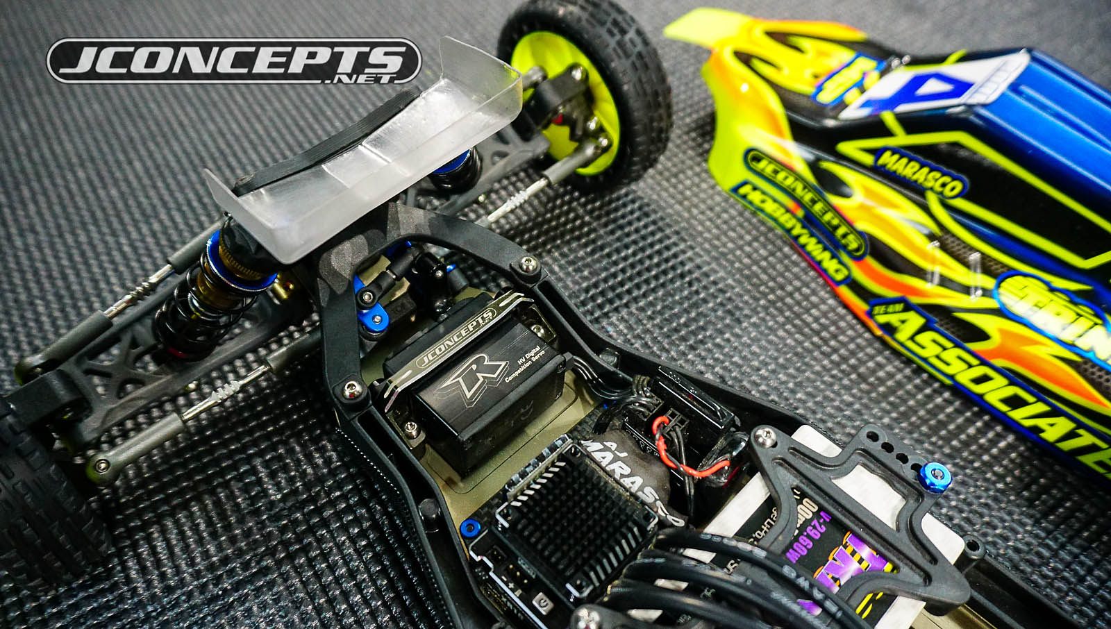 The rear of the car shows the addition of the new JConcepts Rear Diffuser for the B6.1. AJ noted that running with the diffuser on, he felt more comfortable in the high-speed sweeper than with it off and that he "likes the look of the diffuser while driving his car," so it stayed on.