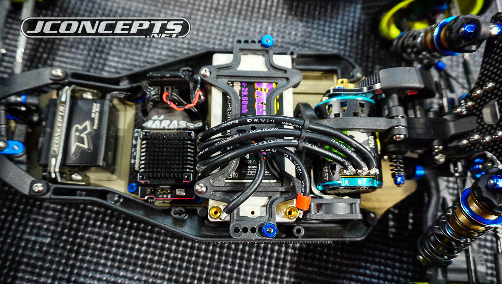 As we move towards the center of AJ's ride, we can see the stealthy JConcepts machined Laydown|Layback motor plate for the B6.1 making an appearance. For stock racing, the machine motor plate has been a hit for its lightweight properties and clean look. Something that might fly under the radar is the 3-wire holder that AJ has that hold the motor wires in place for a more 'pro look.'