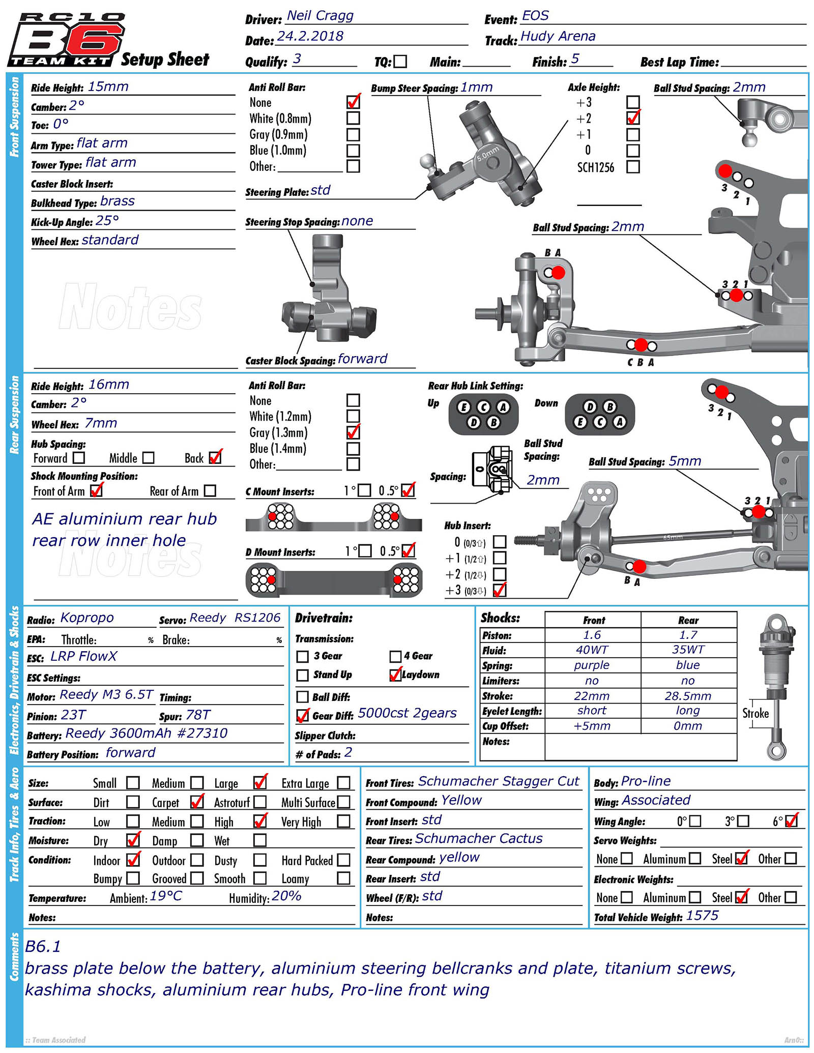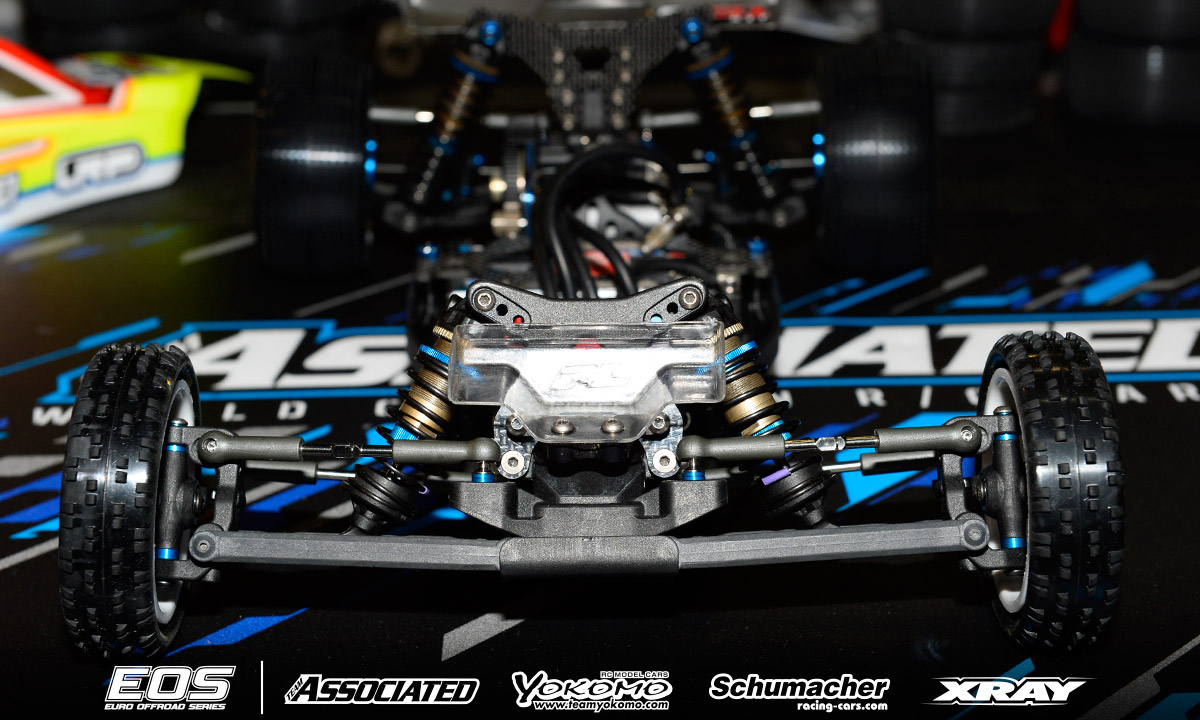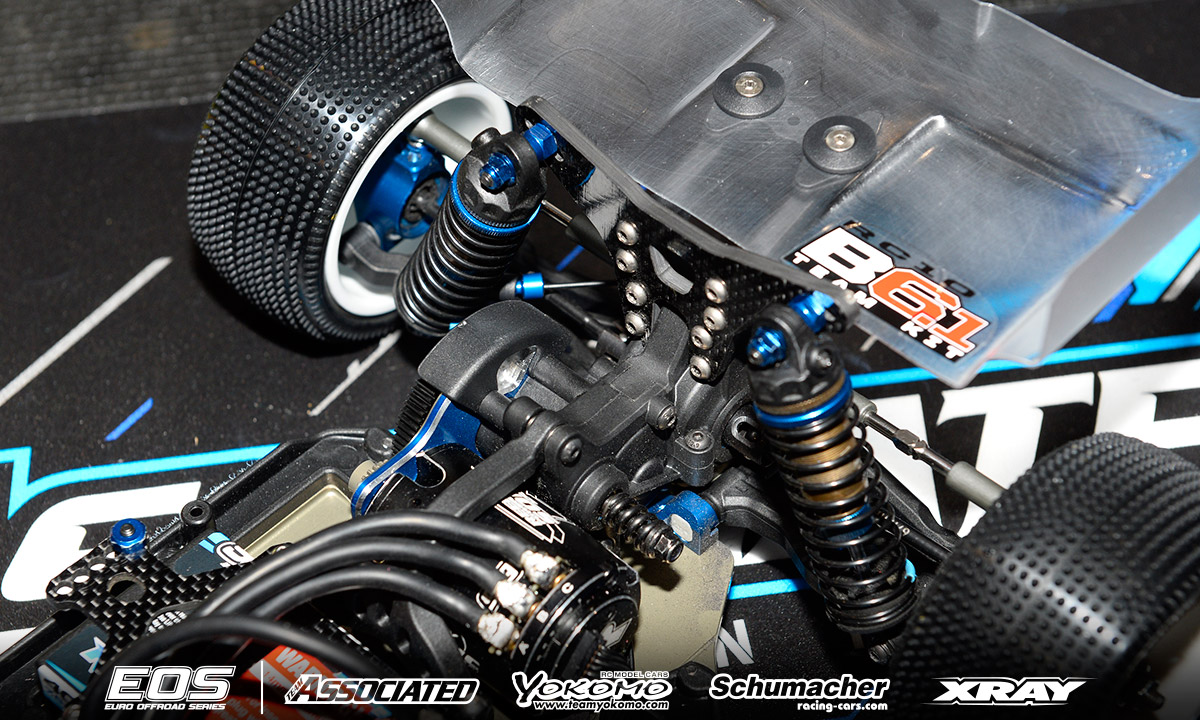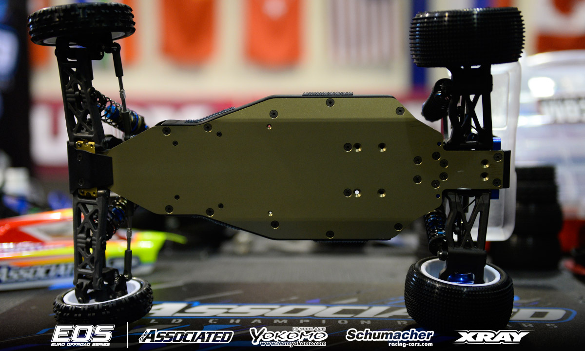 Chassis: Team Associated RC10B6.1 Motor: Reedy Sonic 6.5T ESC: LRP Flow X Batteries: Reedy 4000mAh Radio/Servo: KO/Reedy Tires: Schumacher (handout) Body: Kit Remarks - Winner of the last EOS encounter in Daun, Neil Cragg is debuting Team Associated's RC10B6.1 Buggy. The new car features an updated gearbox that allows a differential height adjustment and makes maintenance easier thanks to quicker diff access. The chassis is some 2mm shorter than the previous version and the front shock tower has also been updated. Neil is using a complete aluminium steering system, aluminium uprights and 67mm driveshafts. A Pro-Line front wing and steel chassis weight complete the option part list.