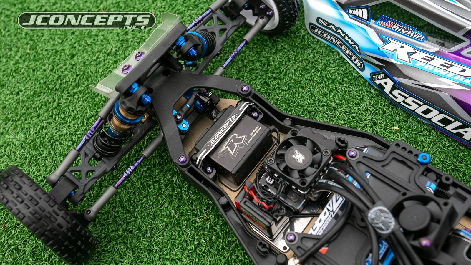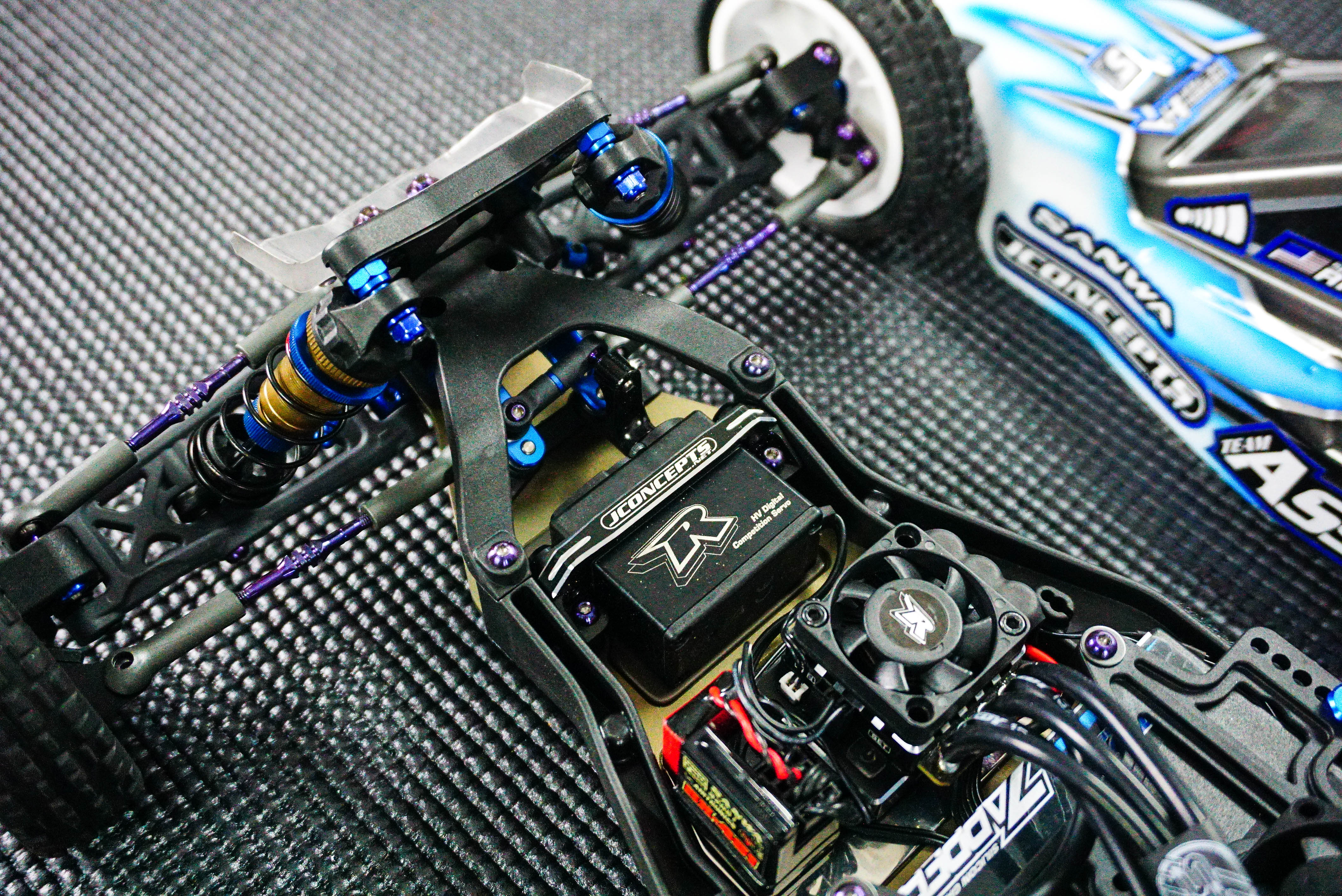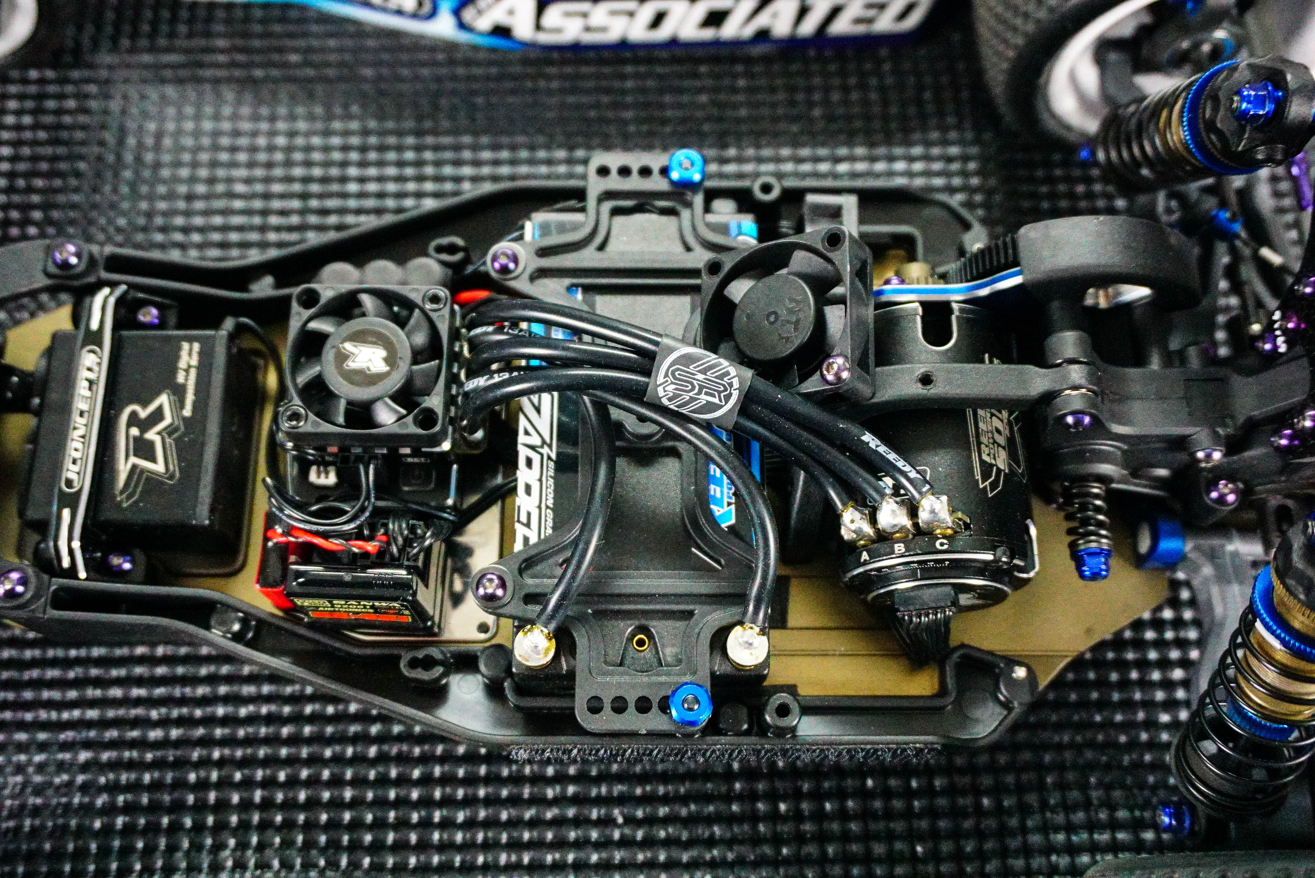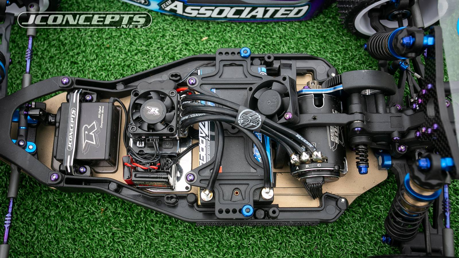 Careful eyes can see that Spencer is running the JConcepts Lightweight Motor Plate for less weight and lower CG. When traction is up, CG plays an important part keeping the car on all 4 tires and having some excess material taken out of the motor can help the car maintain a lower CG.
