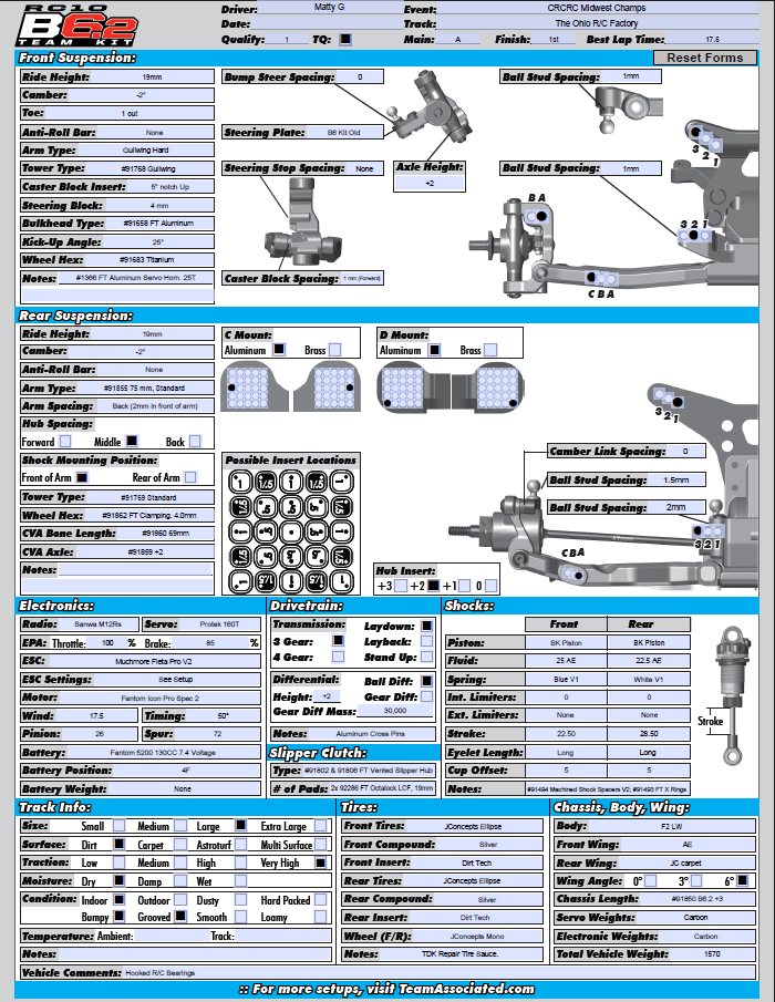 Hitting the track on Wednesday was bitter sweet, I made three changes on my B6.2 from my Top Gun setup, A gear diff, Brian Kinwald's Revolutionary 12 Hole Progressive Pistons, and V1 Blue Front Springs! I was able to set the TQ over Kamryn and Win the First Two Amains!