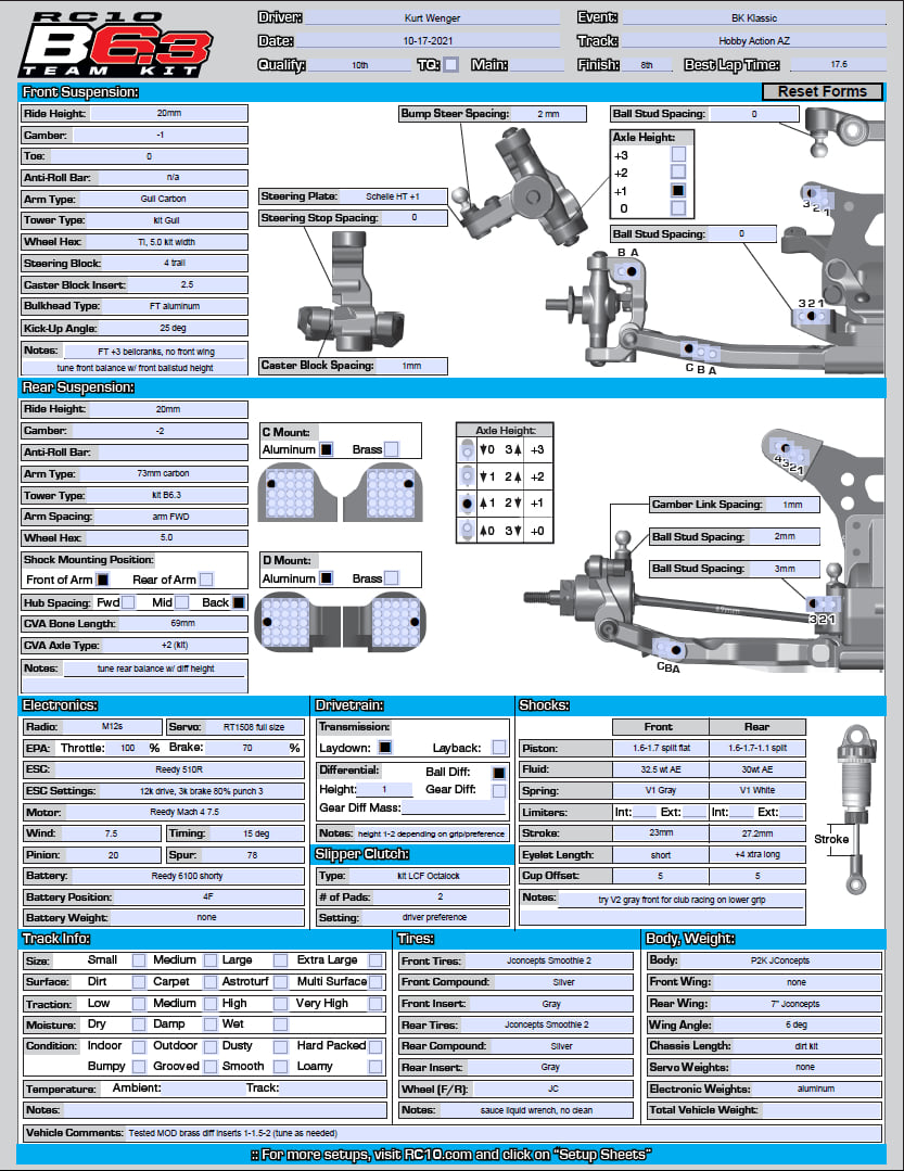 I preferred changing the axle heights F/R to #1 setting with rear hub inserts and front axle height bushings. This is what I'd recommend for 80-90% of club racing. Unless you are on a non-slip high grip surface then the #2 axle heights are great for "big race" traction but can be a bit unpredictable as grip decreases.