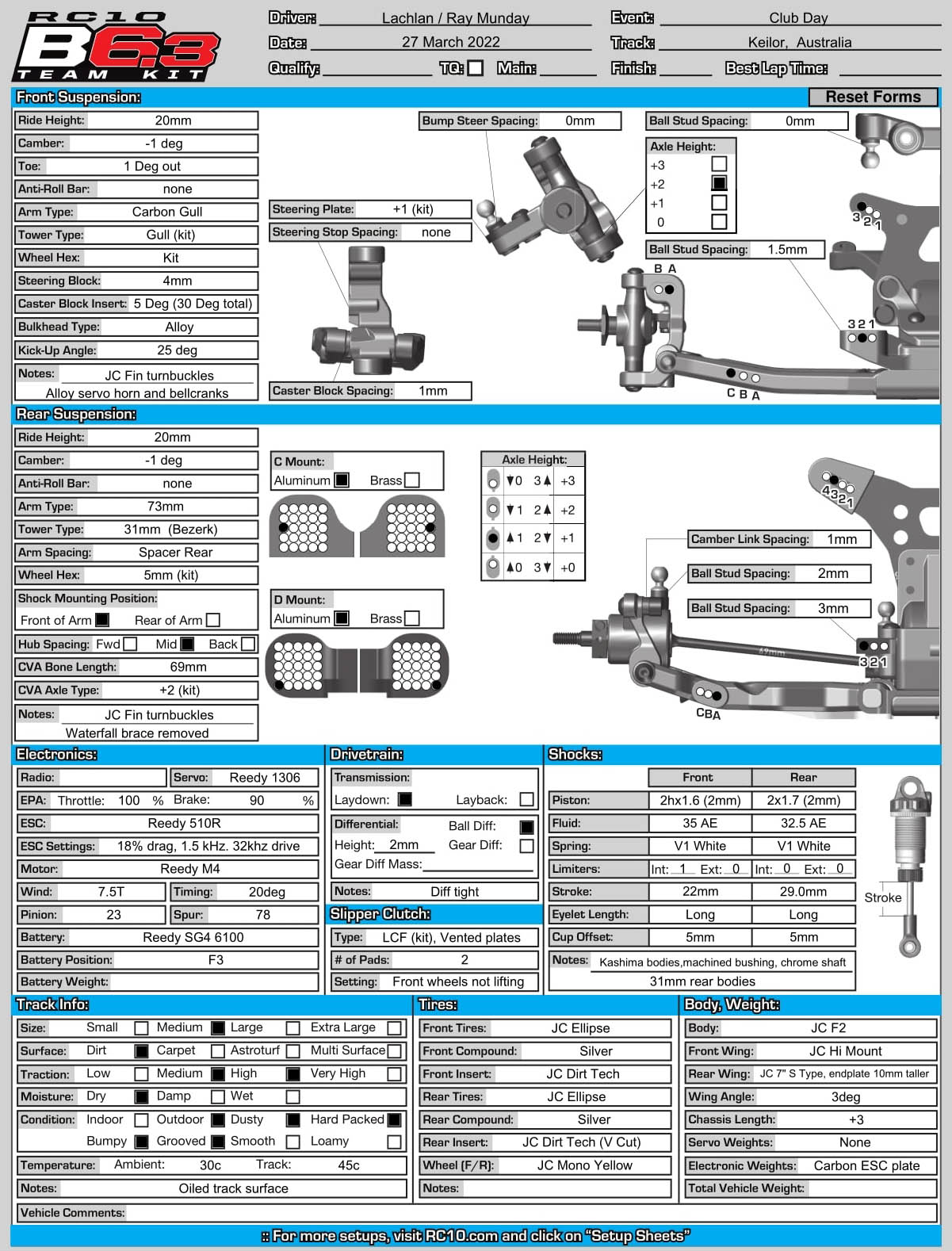 Our setup is not far from the kit B6.3d setup and the car is very easy to drive. On these surfaces too much weight at the rear loses a lot of corner speed, so we use the laydown transmission, alloy C/d blocks, and no rear arm sweep.