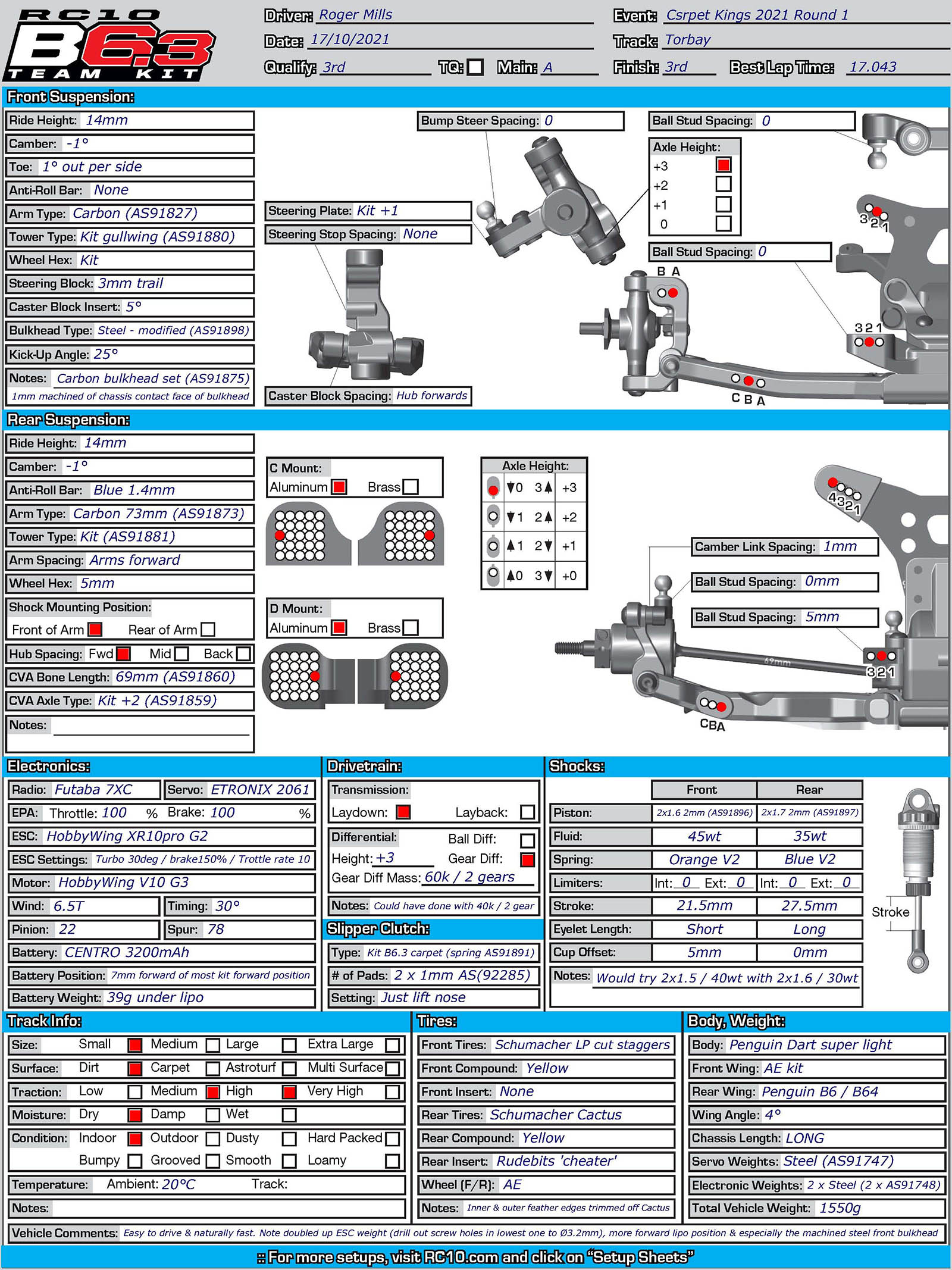 Great B6.3 Setup from Roger from the recent Carpet Kings first round. There are 2 setup files, the first one has some experimental parts (left) and also an alternative one which has minimal modifications (right) that will also work great.