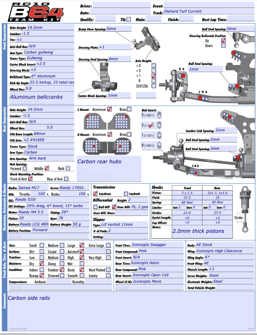 Attached is my current turf setup for the b6.4 in time for tomorrow's race! Below is my initial thoughts on setup after the first few weeks of testing.