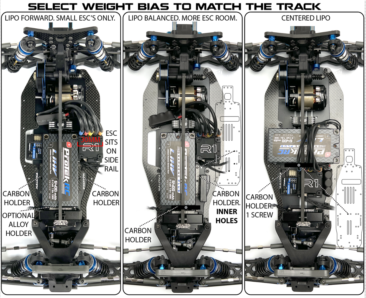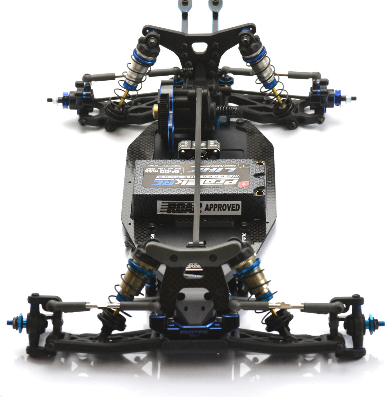 In addition, the 4mm thick carbon chassis brace doubles as the lipo strap for secure shorty pack holding (add foam spacers if using an LCG pack).