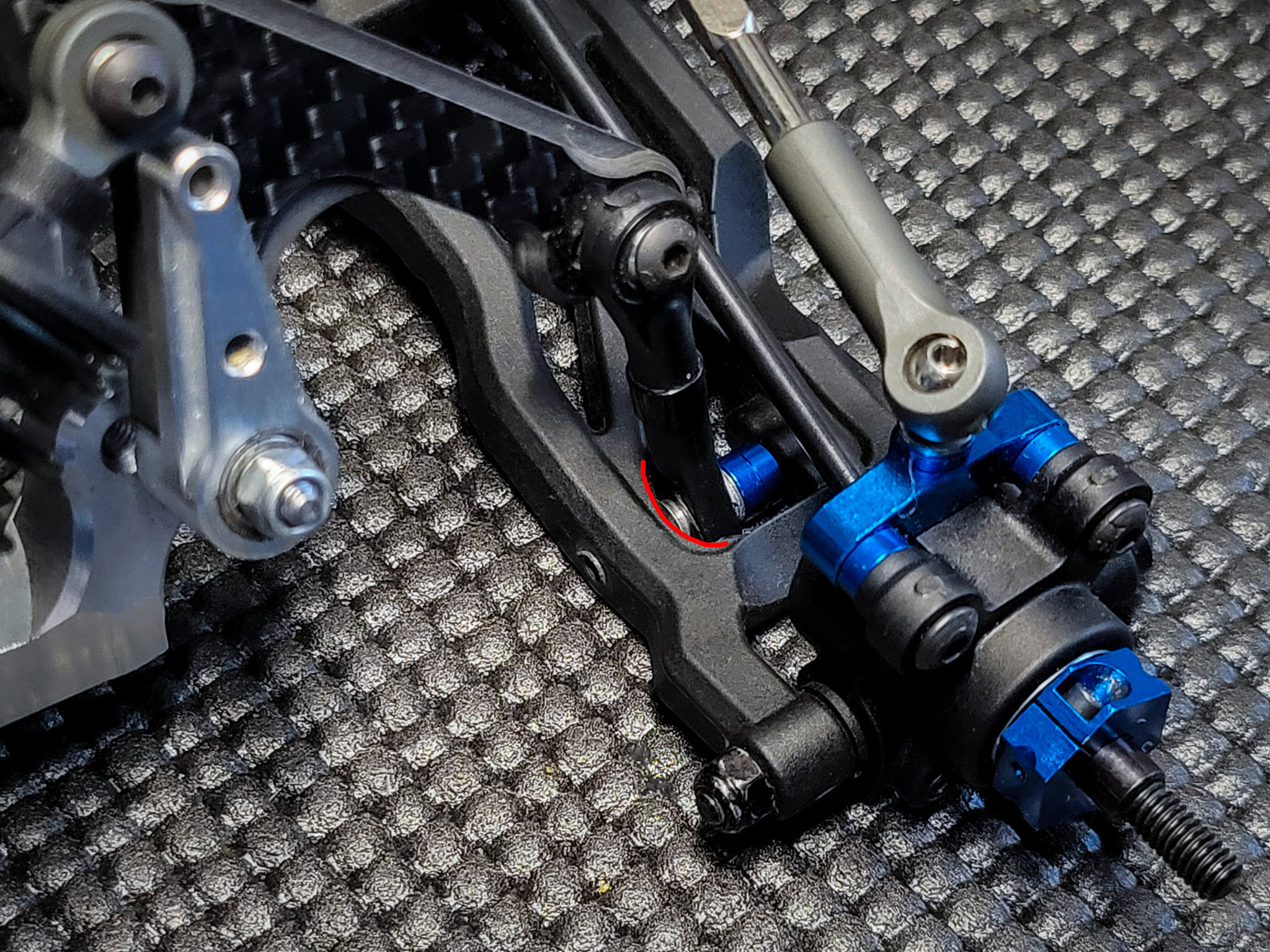 ***NOTE the mounting position of the rear push rod on the arm as it differs from the manual. It's moved inside the arm to accommodate the arm being flipped and pushed forwards. A small amount of material was removed from the arm to ensure clearance at full travel, marked in red on the photo***