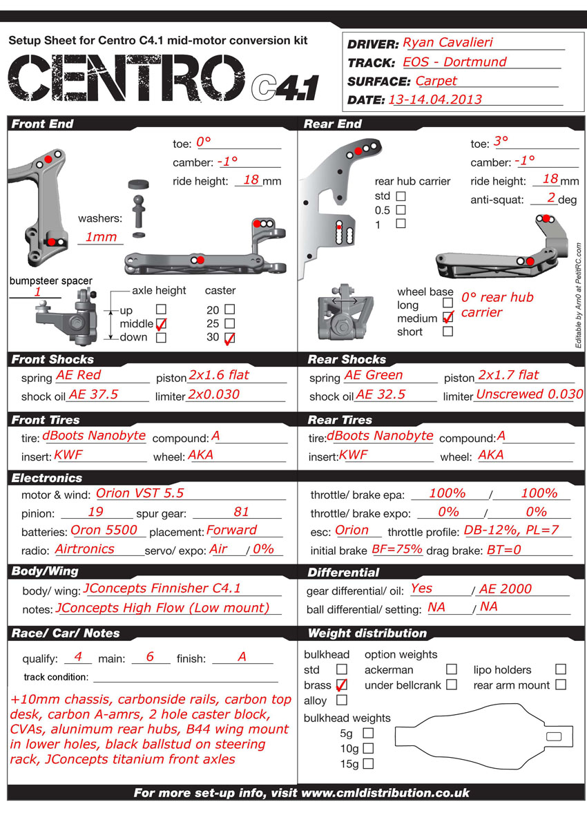 Remarks 4-time World Champion Ryan Cavalieri is making his carpet racing debut in Dortmund, Germany using the Centro C4.1, made by UK Associated distributor CML. Having built the car just for this race, Ryans C4.1 needed some tweaks after he arrived and ran the car. Up front he is running a brass bulkhead for added weight and on the chassis he has mounted carbon stiffeners, which are a standard part but one that Ryan overlooked when building the car prior to coming to Europe. Following a difficult start he managed to improve the car and alter his driving style to end up 4th after qualifying.