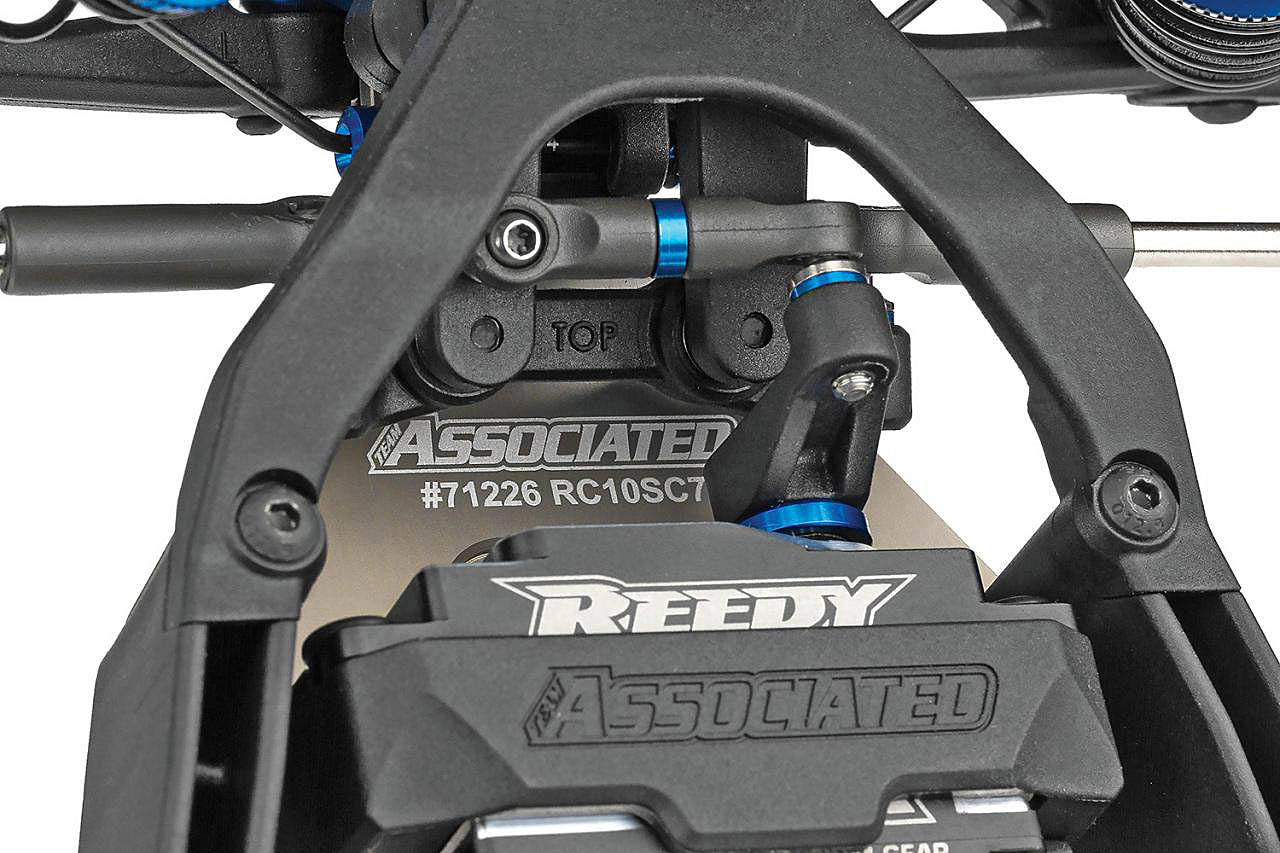 The RC10SC7 shares key components with the RC10B7 and RC10B7D Team Kits, making it easier than ever to run multiple classes at the same time. The primary suspension update is to lower the CG with shorter 25mm long front and 31mm long rear 13mm big bore shocks. The new chassis design is a stronger short course version of the RC10B7 buggy design and gets a new gull wing long arm suspension to improve grip and predictability in all conditions. On top of that, the kit includes updated zero KPI steering blocks and updated caster blocks, along with the legacy B7 features for tuning the front-end feel. The new steel front inner hinge pin brace and updated B7 V2 caster block add to front end durability. The new RC10SC7 offers the same mounting locations along with anti-roll bar hardware as the RC10B7 while pairing nicely with wide mount anti-roll bars that fit the new suspension arms.