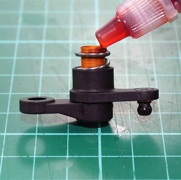 With your Servo Saver partially assembled as on page 29 of the DEX410 manual apply Thread lock (TD39006) to the top few threads of the Servo Saver Shaft (TD713001)