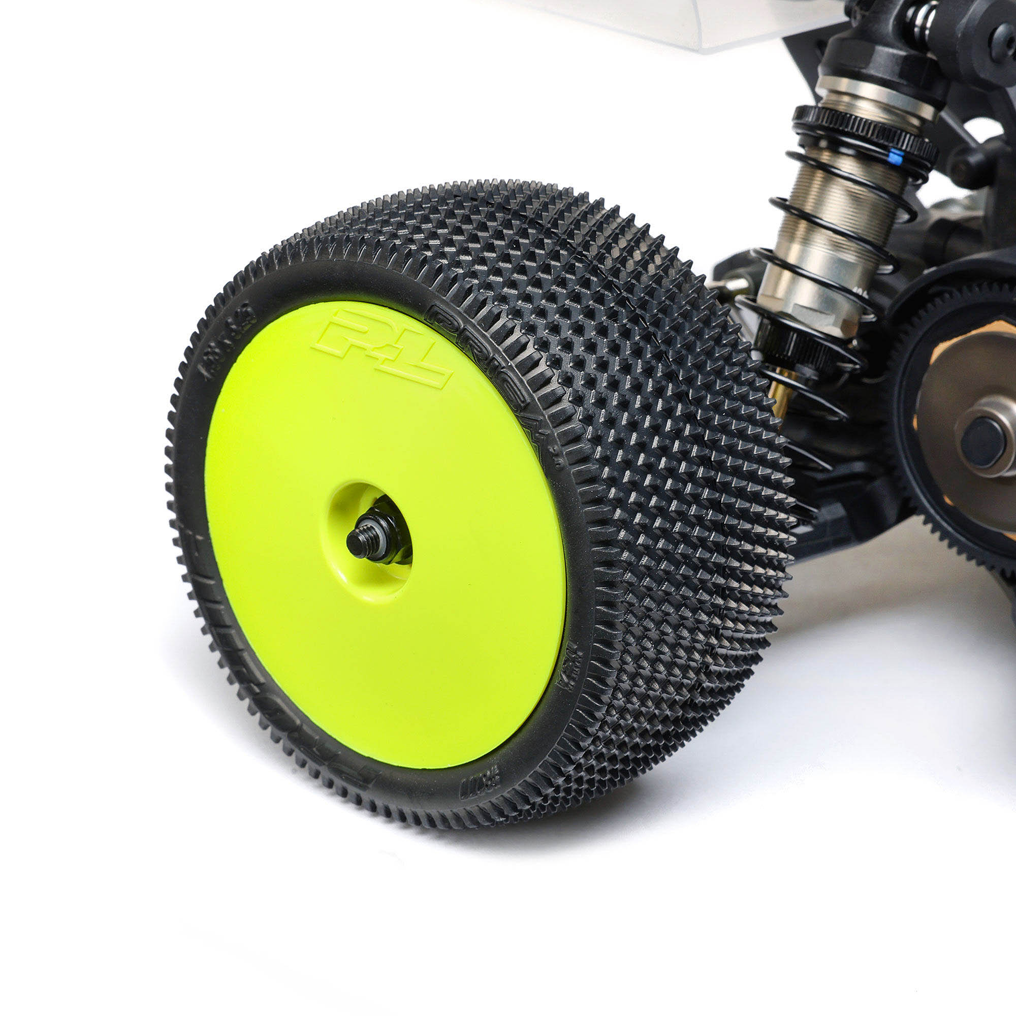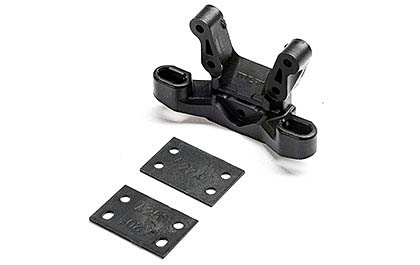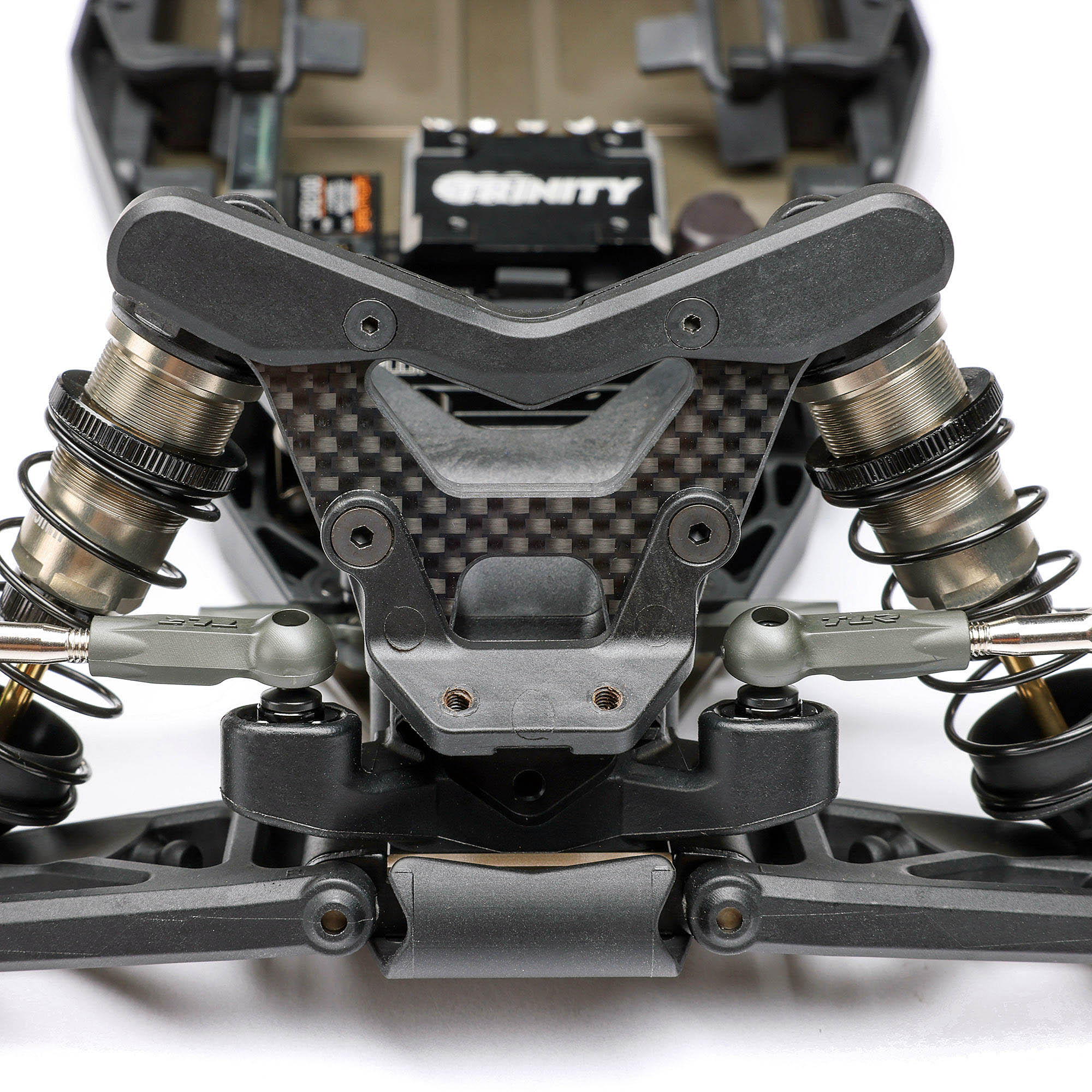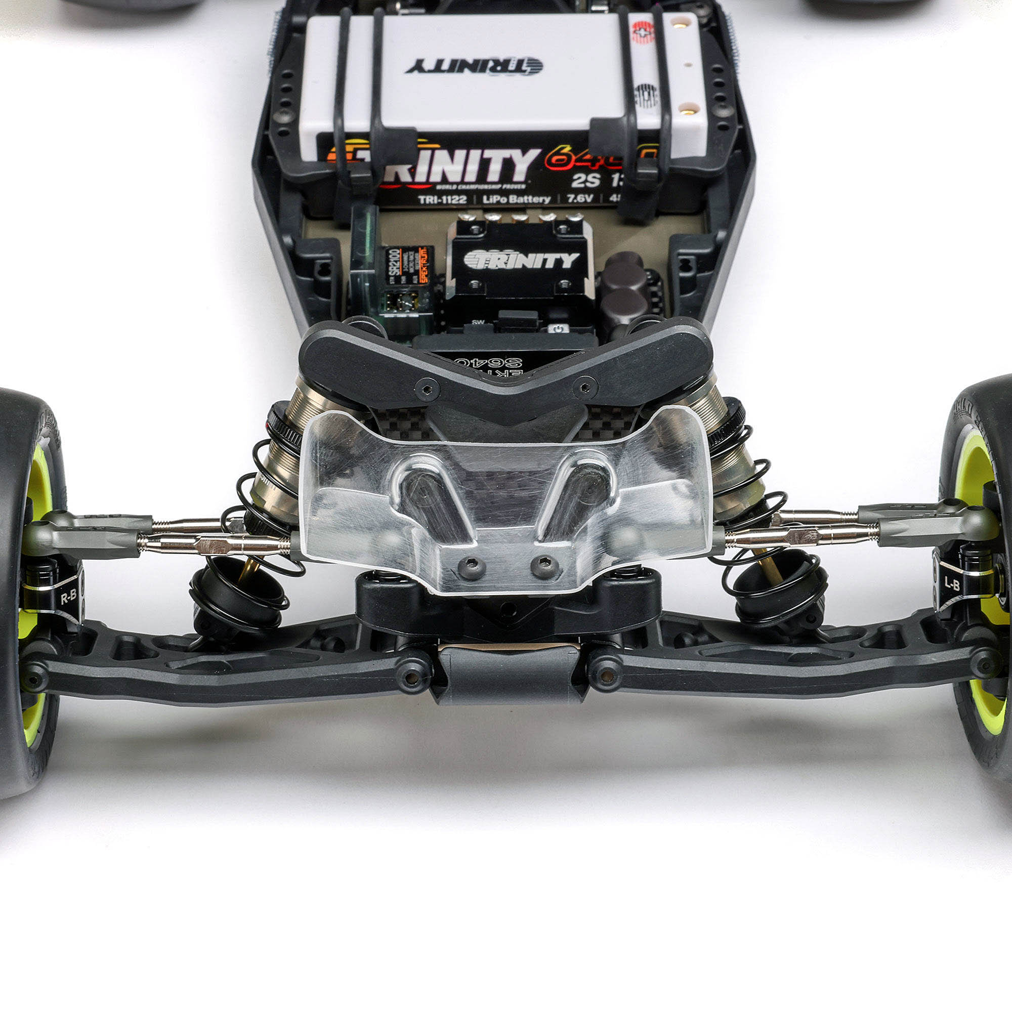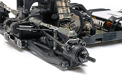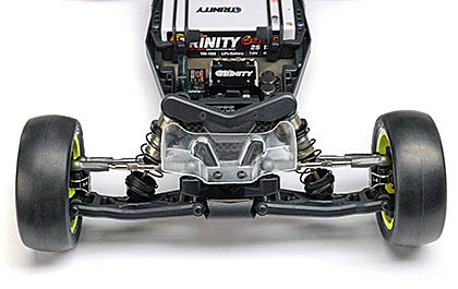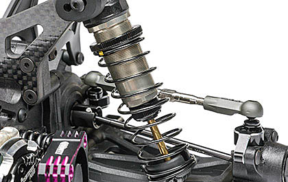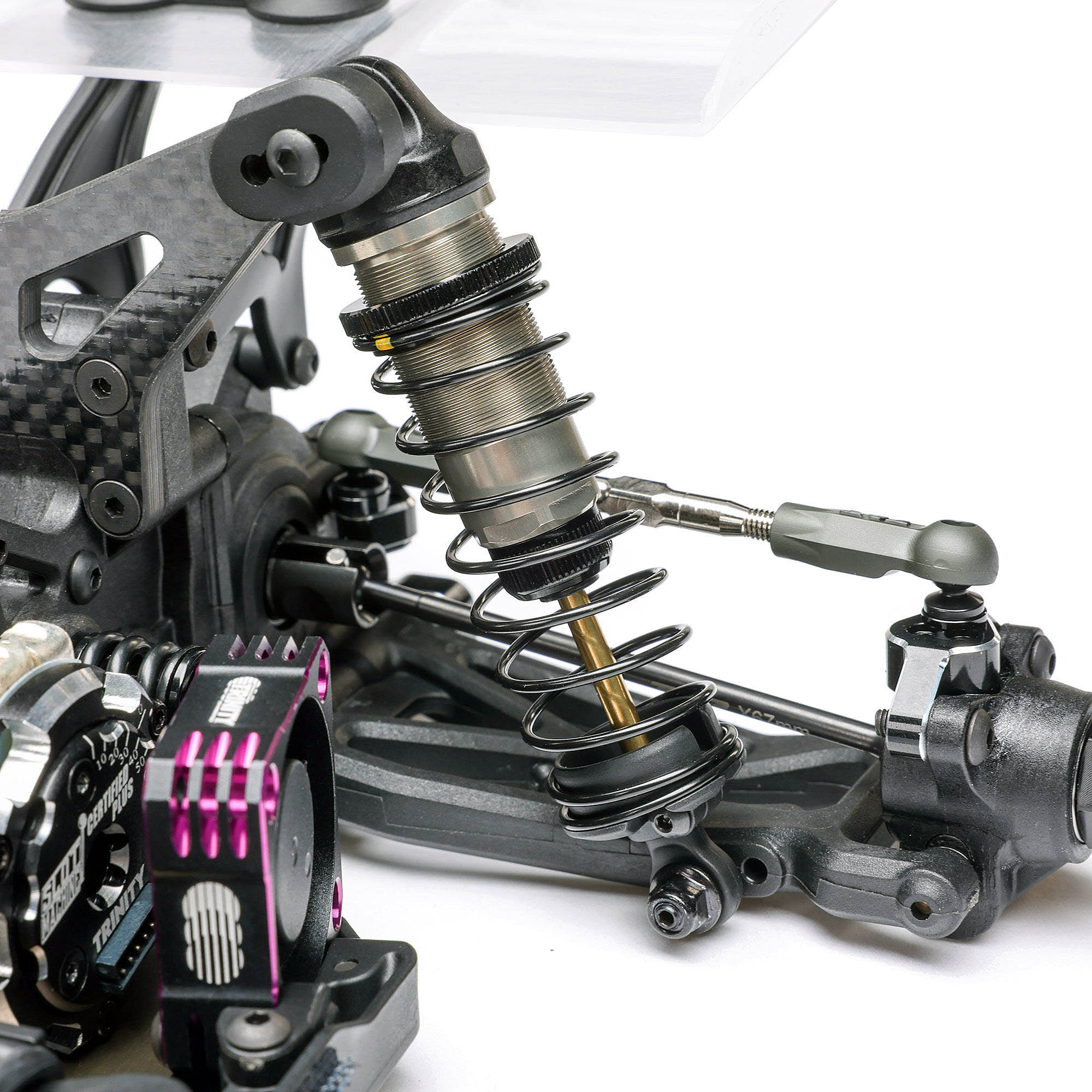 Two front caster block and spindle options let you tune the steering feel to what you want and need on different surfaces; options for wide or narrow king pin locations are available. The wide location provides a more linear feel and keeps the buggy flatter through the corners. The narrow king pin location provides the grip needed to be more aggressive on astro and carpet tracks.