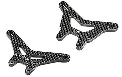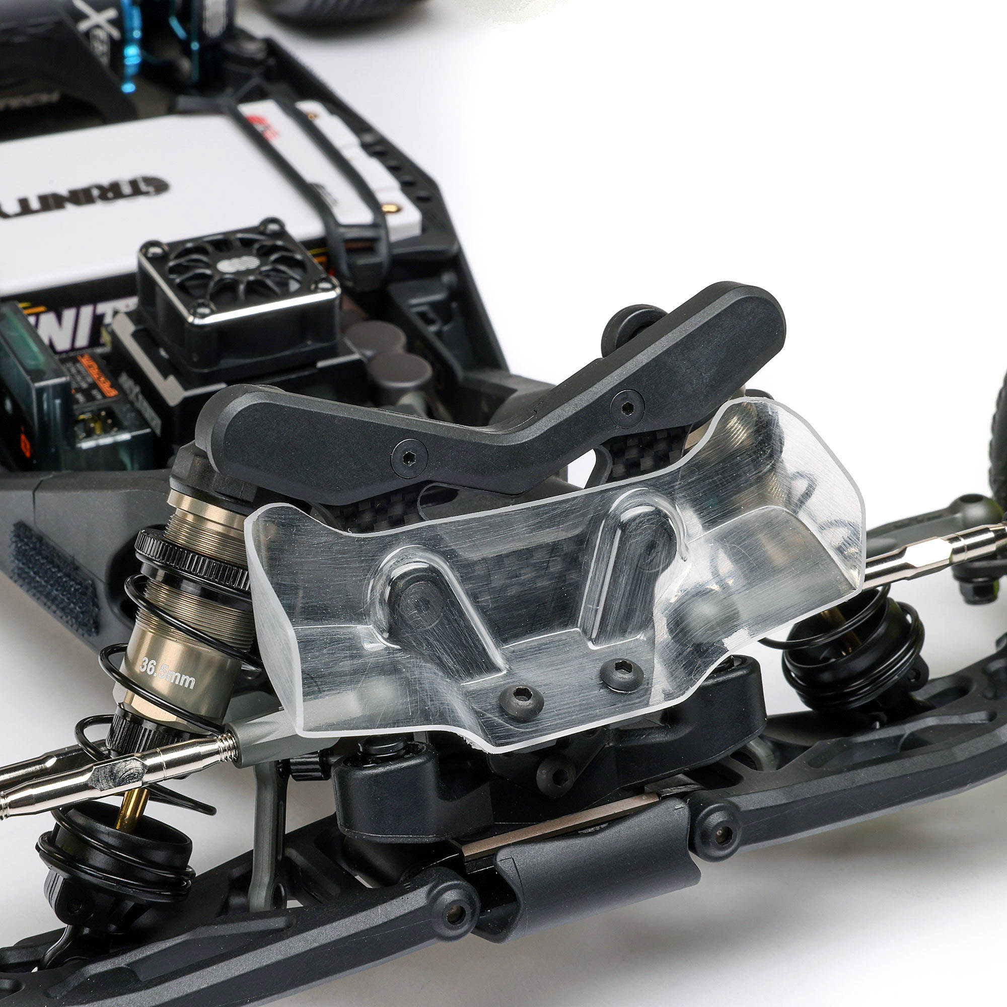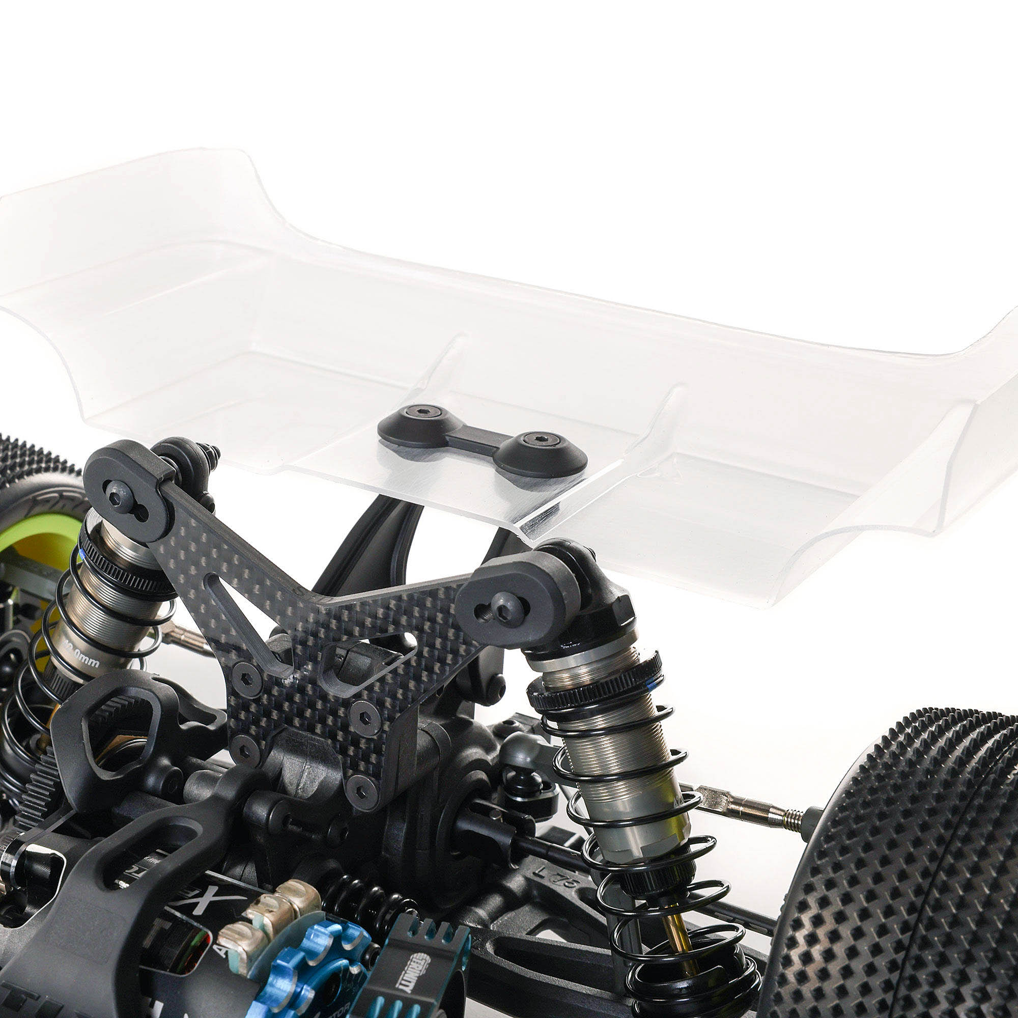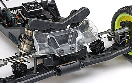 The 4mm front and rear shock towers are made of woven carbon fiber for rigidity and durability. The front tower anchors to the front bulkhead to reduce flex and increase bulkhead strength. The rear tower location allows for more wing adjustment, and for the rear diff to be removed without removing the gear box. Should a rollover occur, included shock tower covers protect the track surface.