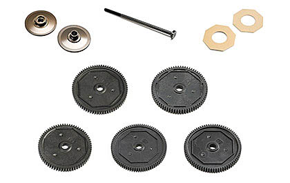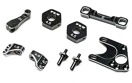 Many aluminum parts - chassis, motor plate, axles, shock stand offs, pivots, ball stud washers, rear clamping hexes, A/B front outer camber block, 25T clamping servo horn