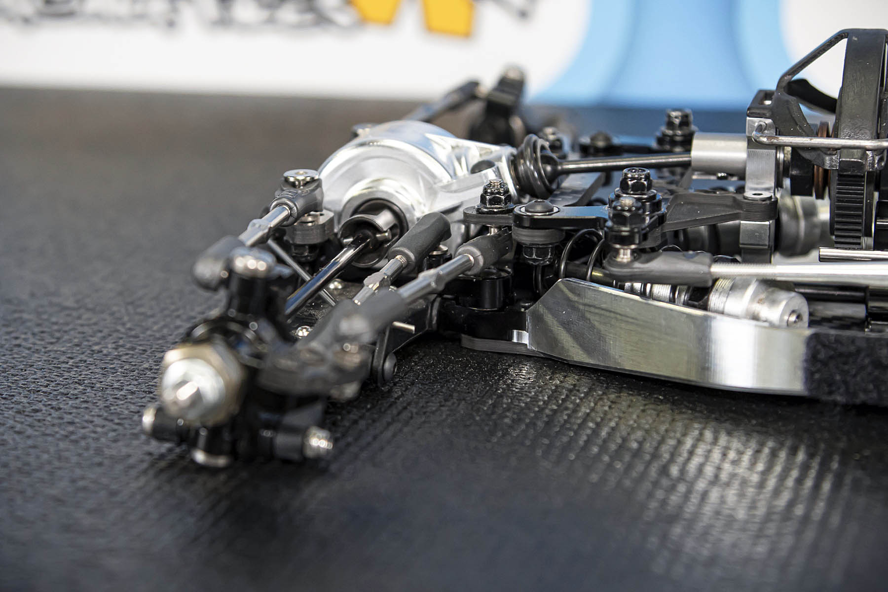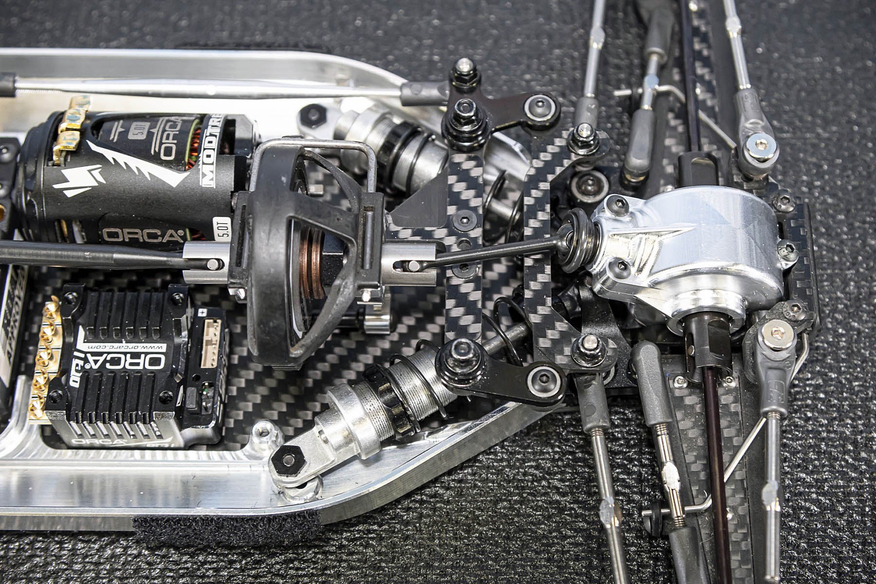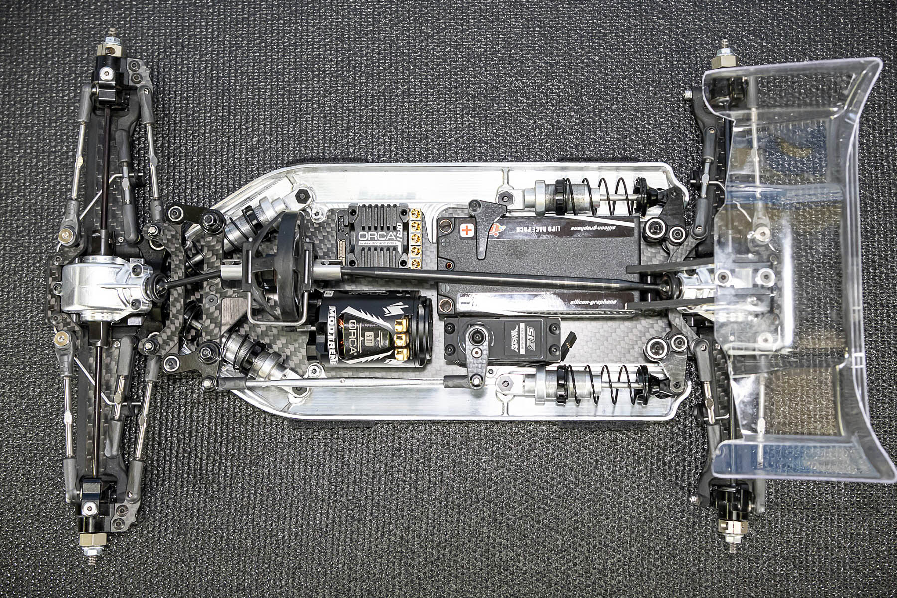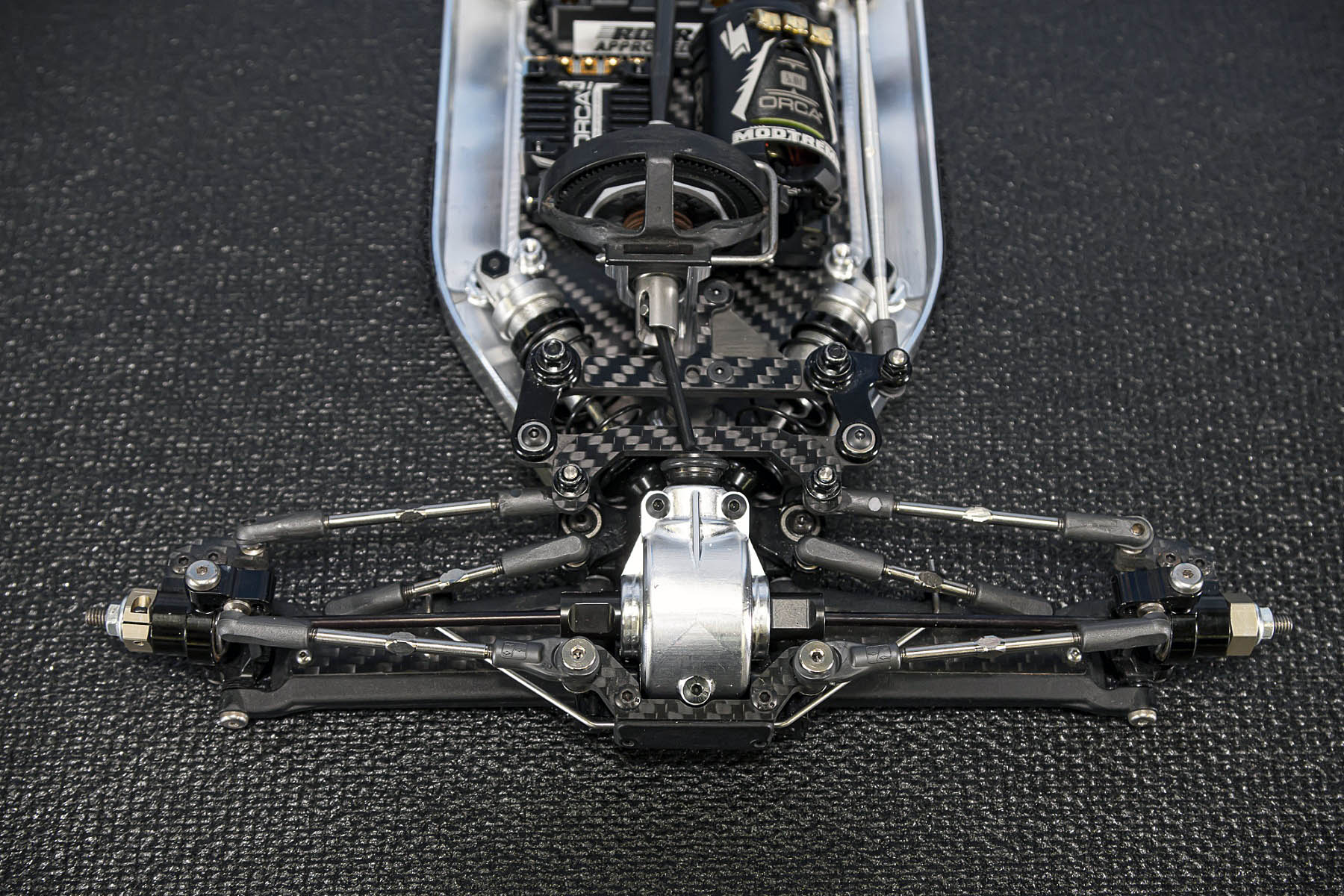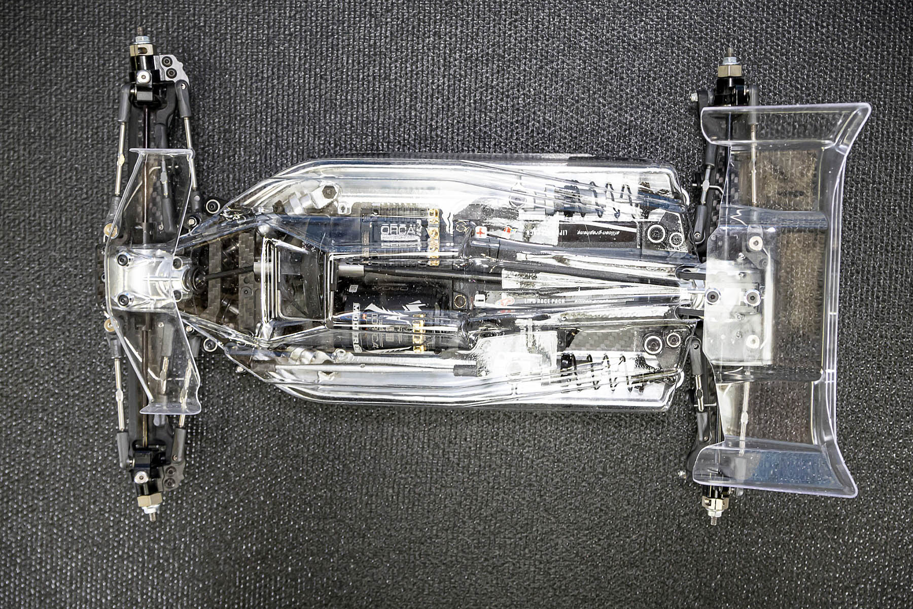 The special features of our car are the weight distribution, aerodynamics and the low centre of gravity and weight. The vehicle presented in Daun had a weight of 1666gr. and that with the heavy aluminium parts, without titanium screws and so on. A current car (competitor stock version, with a lot of titanium and aluminium drive shafts) had a weight of 1660gr. So we can balance the weight in the car as we need it.