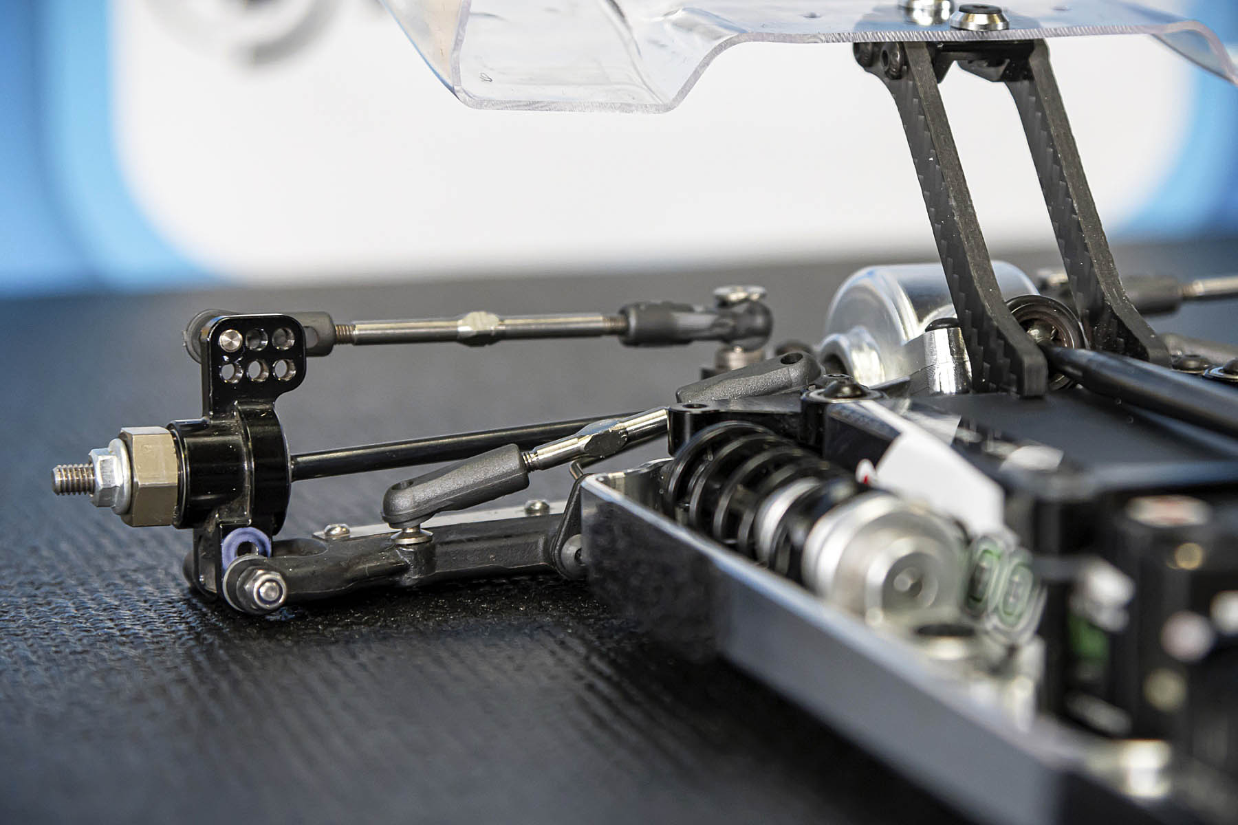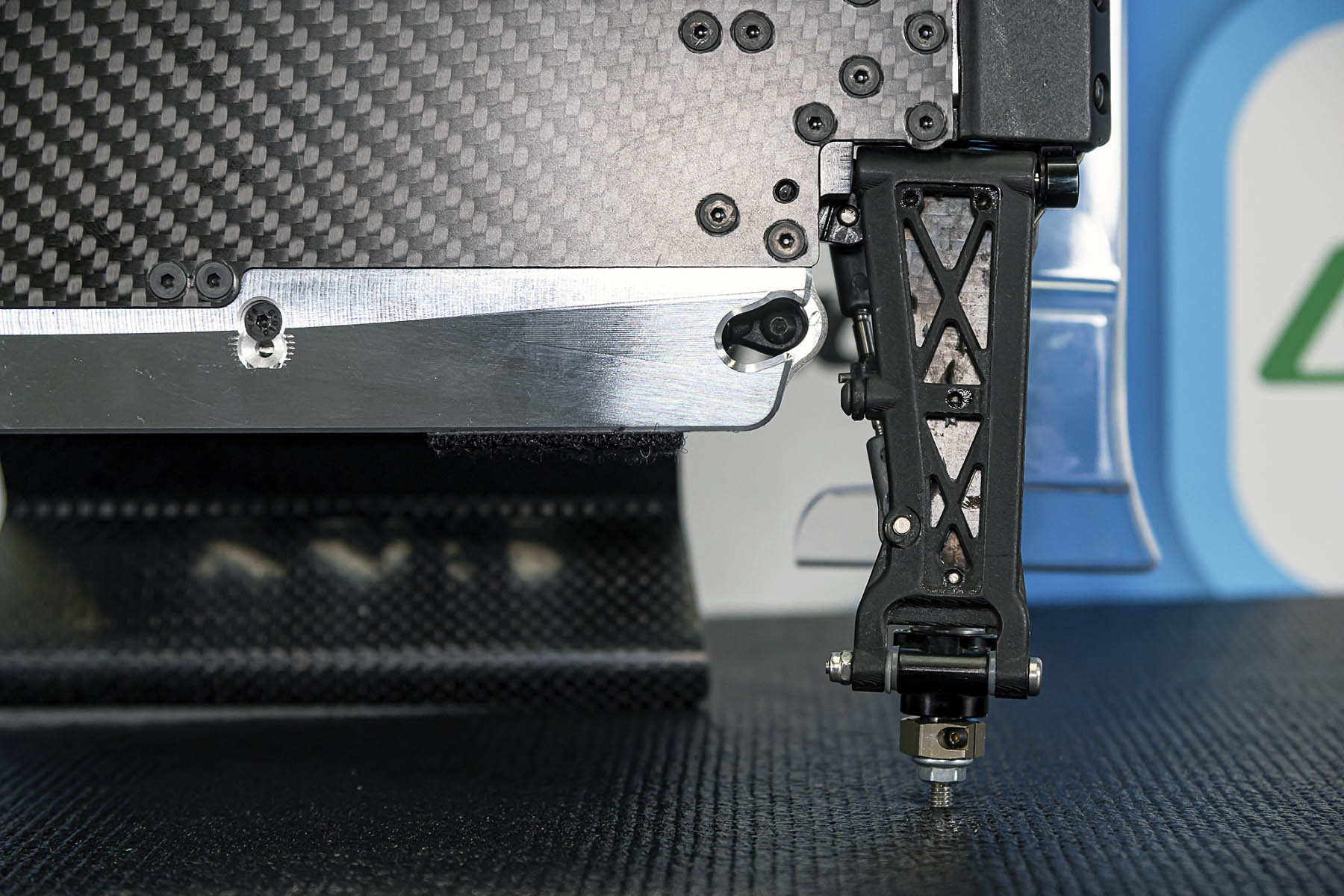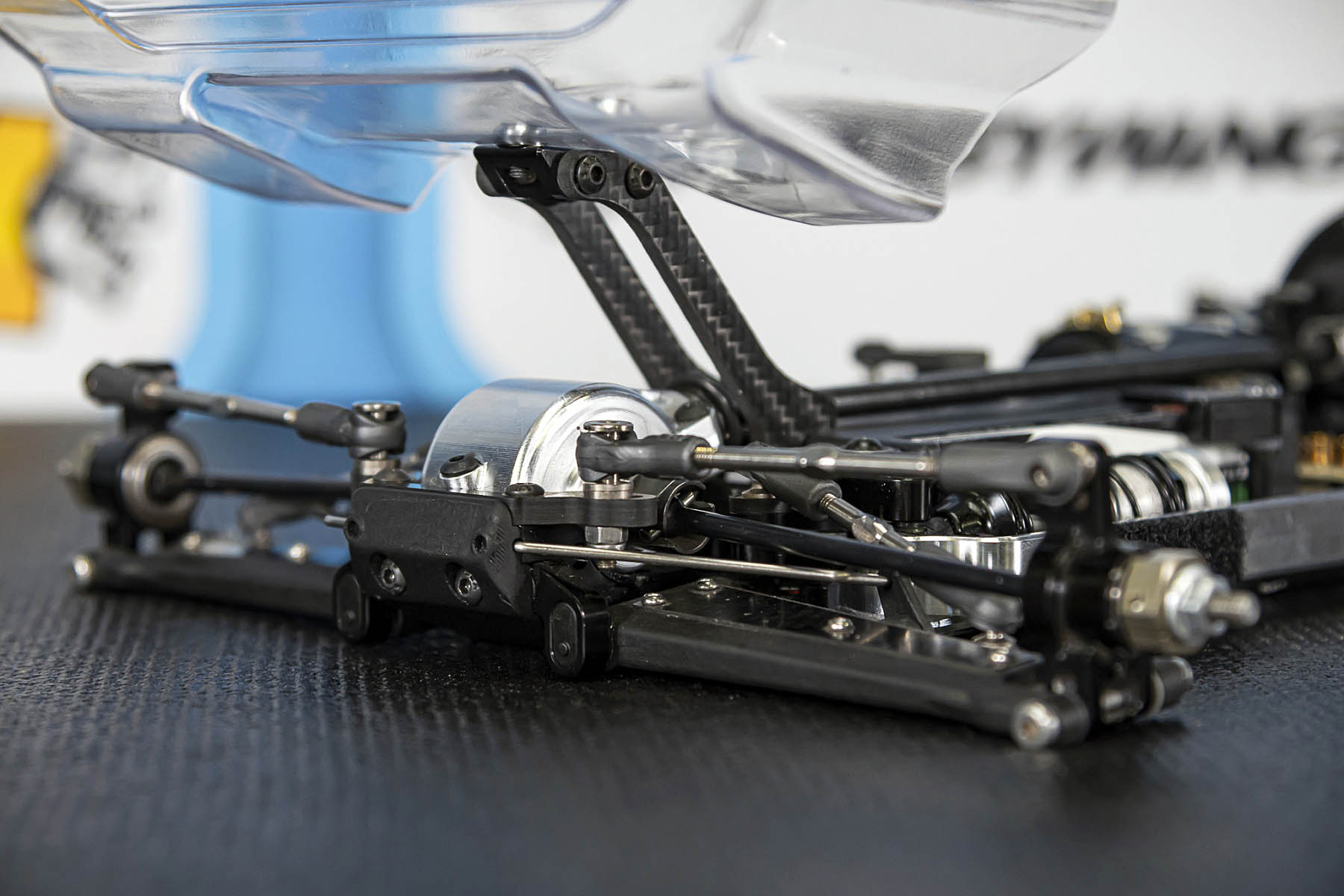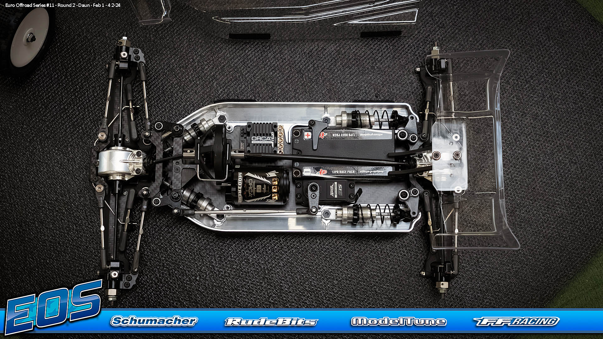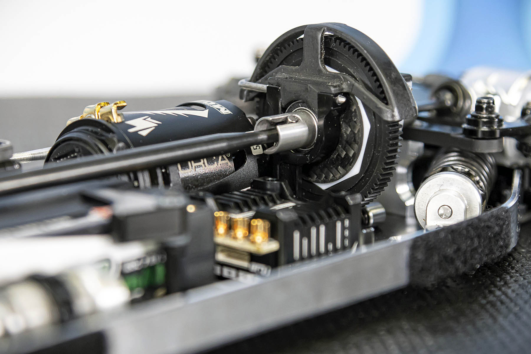 The special features of our car are the weight distribution, aerodynamics and the low centre of gravity and weight. The vehicle presented in Daun had a weight of 1666gr. and that with the heavy aluminium parts, without titanium screws and so on. A current car (competitor stock version, with a lot of titanium and aluminium drive shafts) had a weight of 1660gr. So we can balance the weight in the car as we need it.