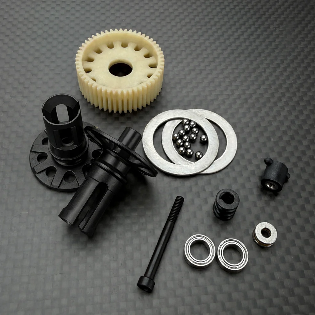 Dirt Kit – What’s Different? The Dirt kit is equipped with a ball differential, while the Carpet kit comes with a gear differential. It also includes springs, shock oil, and initial tuning specifically set up for dirt surfaces.