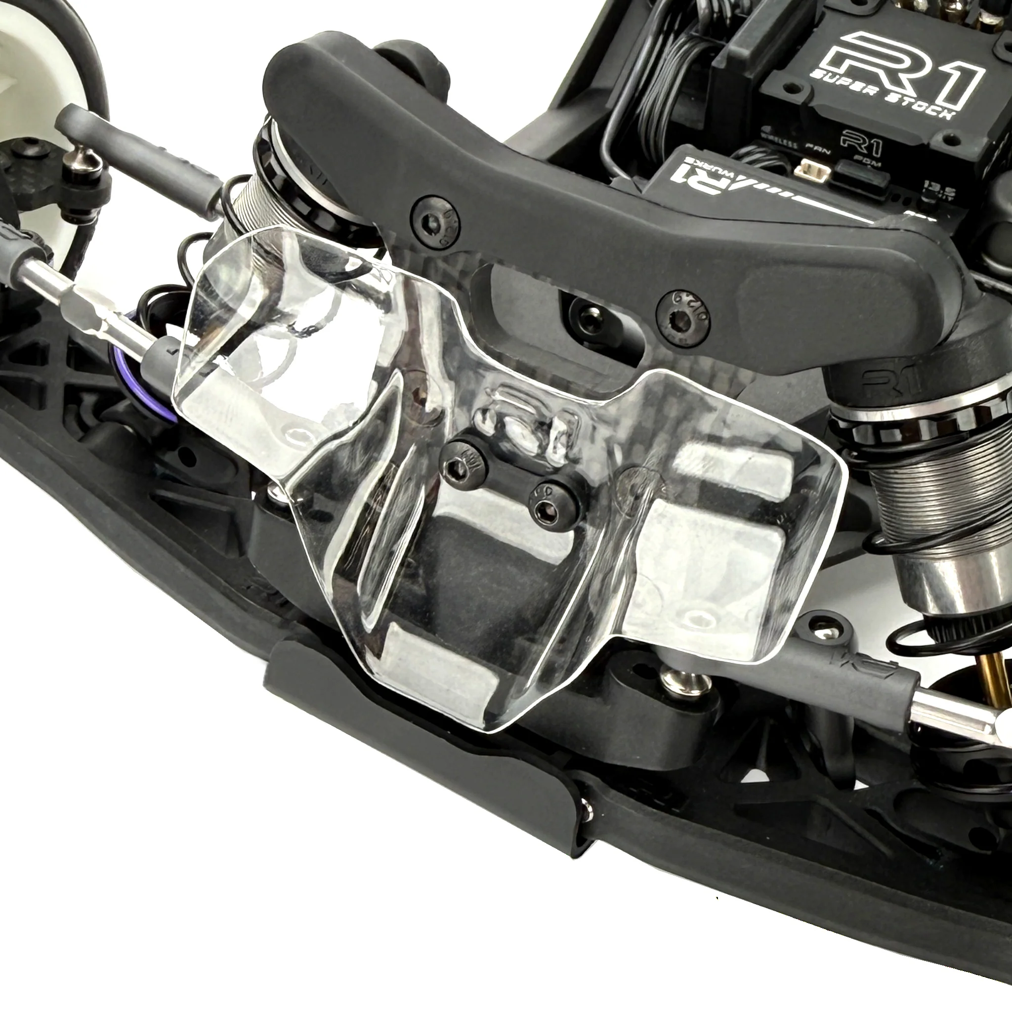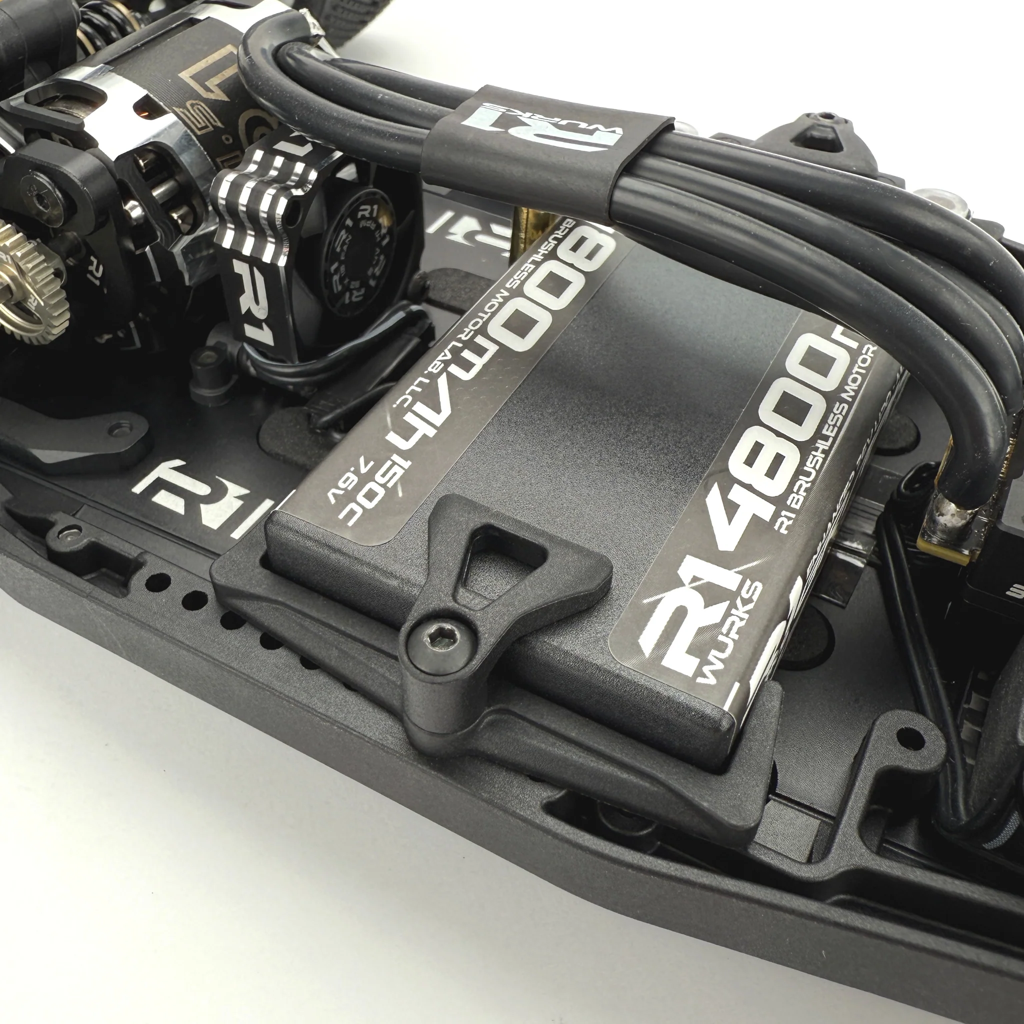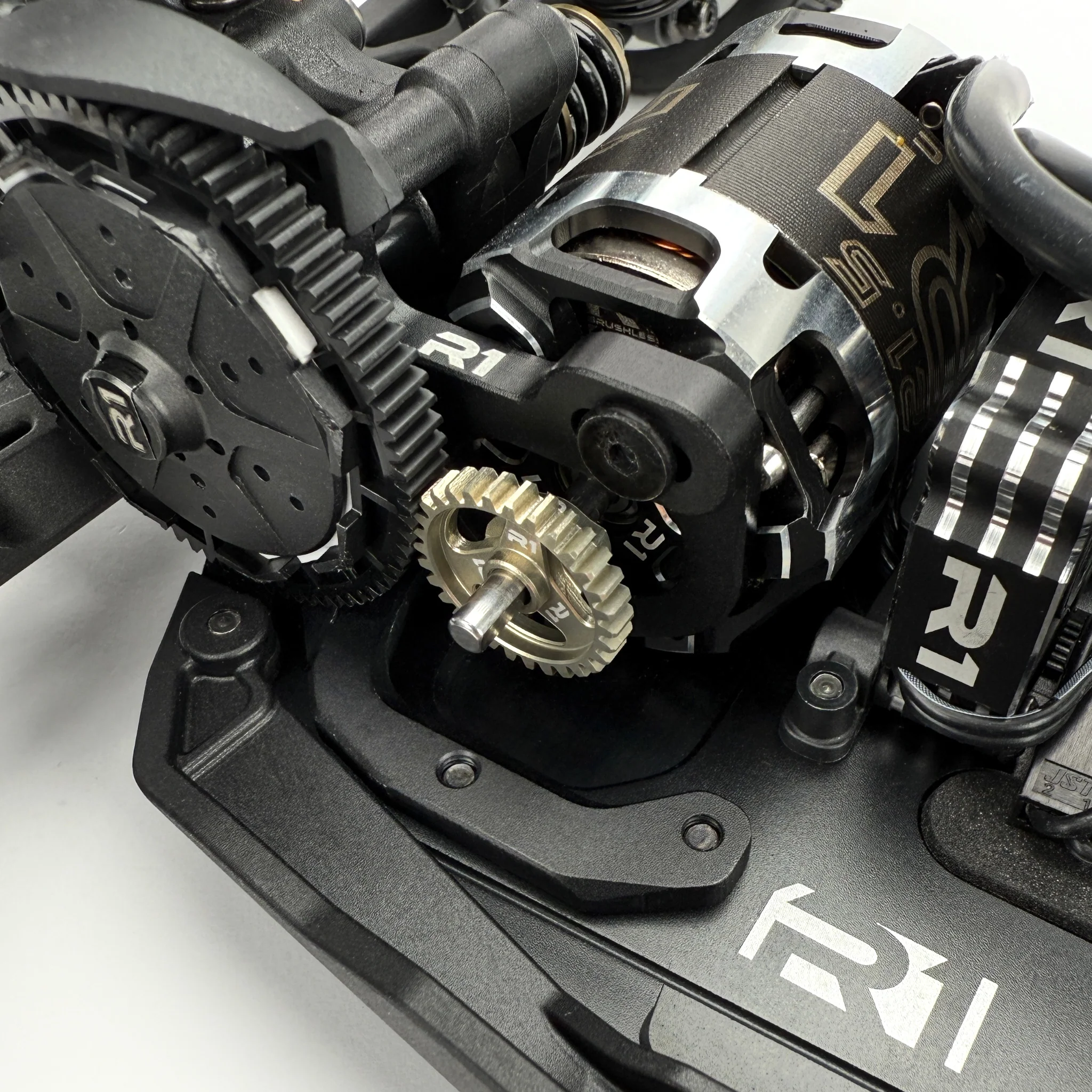 Rear chassis brace options: A key but often overlooked factor in chassis handling is the ability to adjust flex, not just torsional but also longitudinal. With the R1B, we’ve addressed this by extending the chassis side-guard braces to the rear, directing flex toward the middle to improve balance and stability during acceleration and cornering. Additionally, we’ve included an optional 7075 T6 aluminum horseshoe brace that reinforces the area below the gearbox and motor. Some of the mounting screws for this brace can be removed for fine-tuning, or the brace can be removed entirely, which is ideal for low-traction conditions.