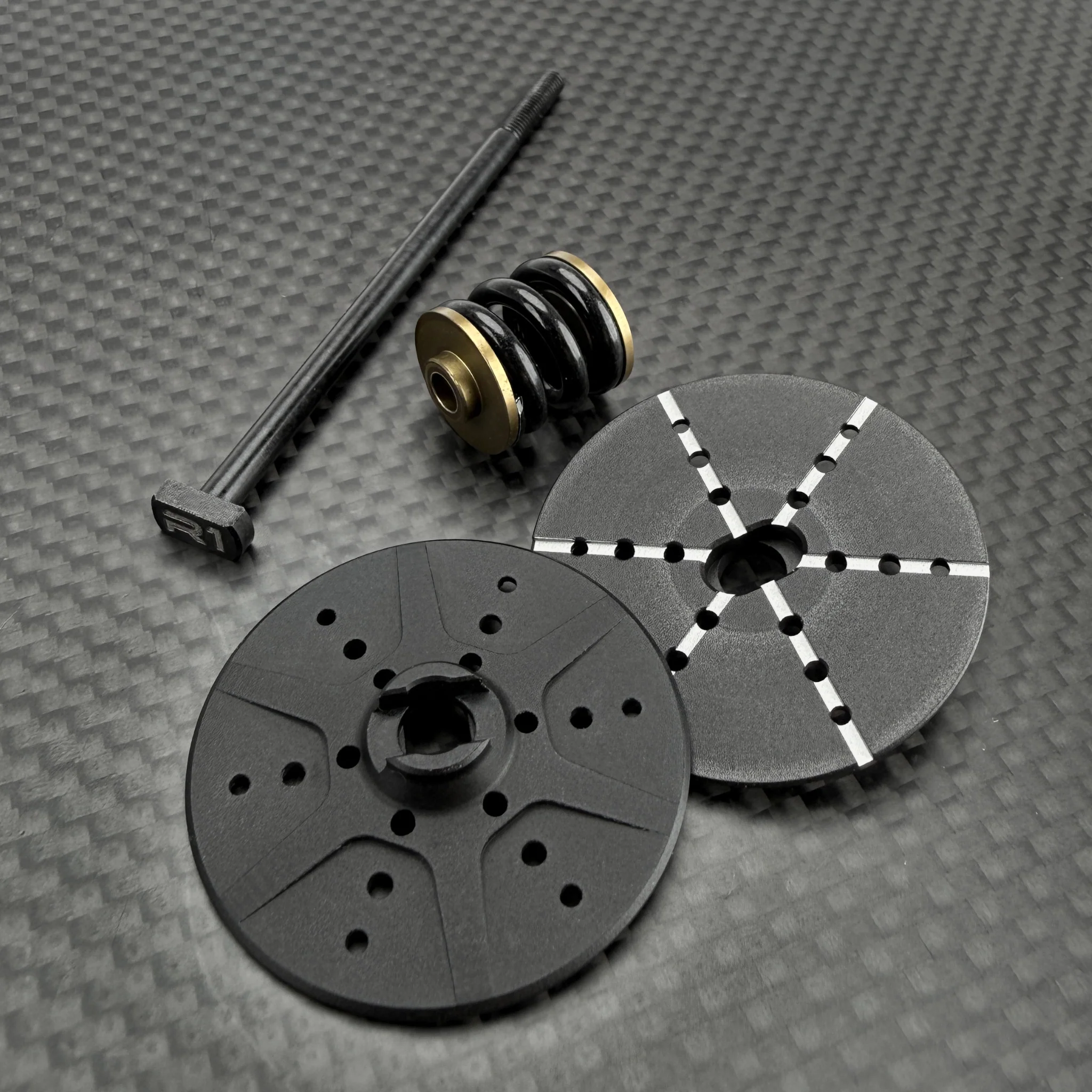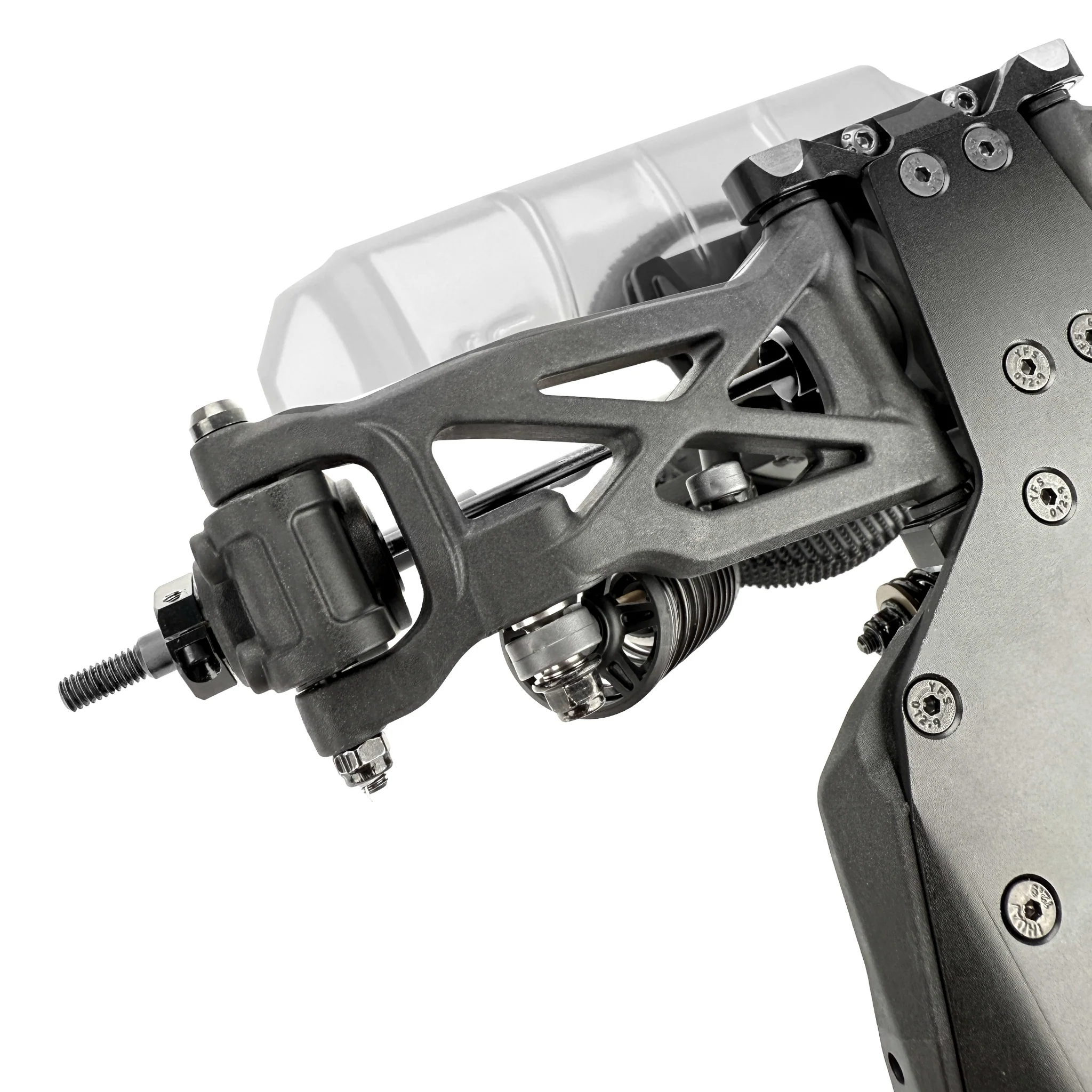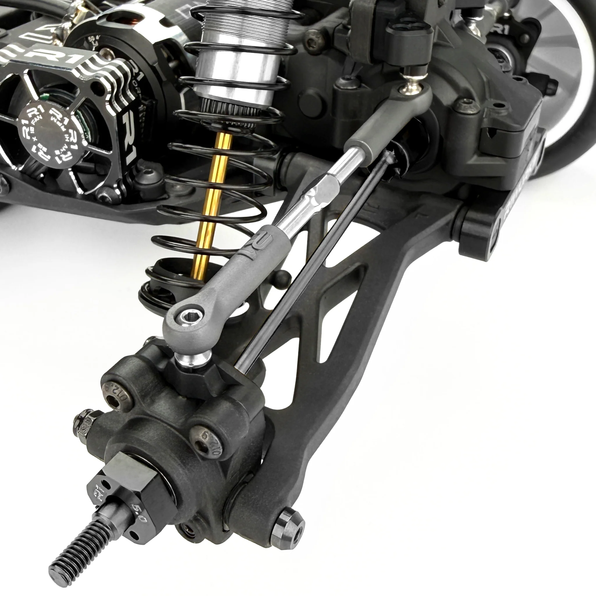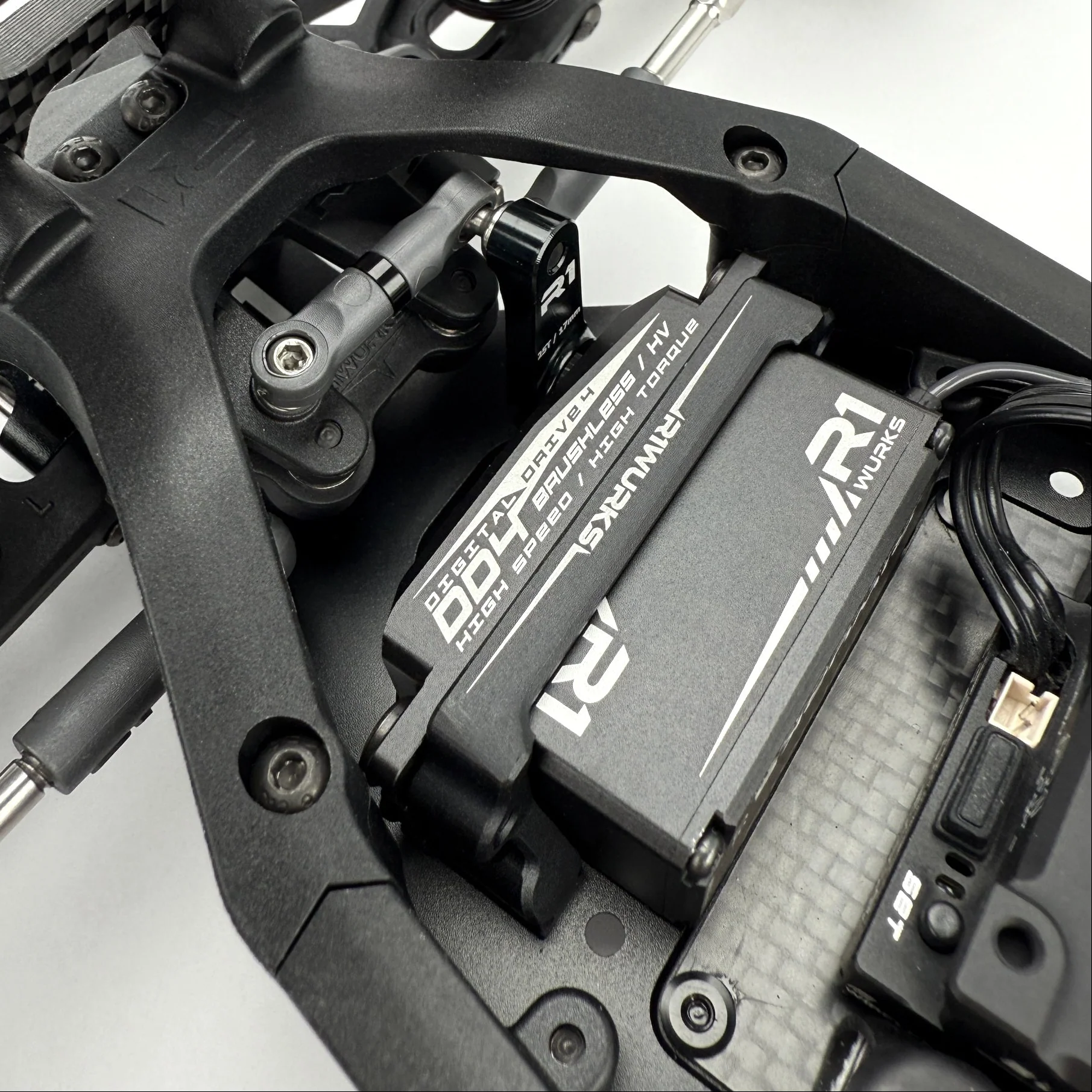 Rear chassis brace options: A key but often overlooked factor in chassis handling is the ability to adjust flex, not just torsional but also longitudinal. With the R1B, we’ve addressed this by extending the chassis side-guard braces to the rear, directing flex toward the middle to improve balance and stability during acceleration and cornering. Additionally, we’ve included an optional 7075 T6 aluminum horseshoe brace that reinforces the area below the gearbox and motor. Some of the mounting screws for this brace can be removed for fine-tuning, or the brace can be removed entirely, which is ideal for low-traction conditions.